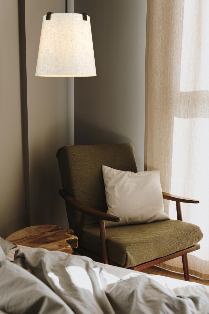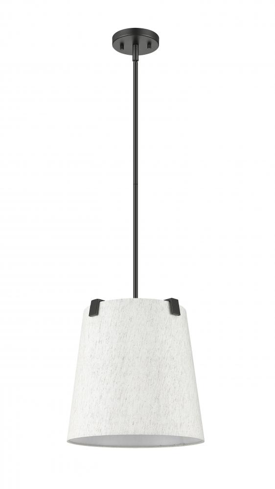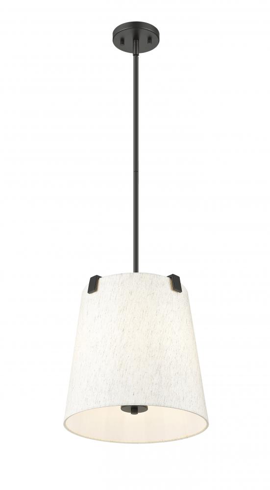 Make a statement in a modern or transitional space with a classic design in fixtures. This three-light pendant highlights islands or living spaces with a sophisticated look, blending bold matte black finish steel framing and accent clips to a cream fabric shade, as candelabra lights filter through the diffused shade. This dimmable fixture offers variable lighting levels to suit different spaces.