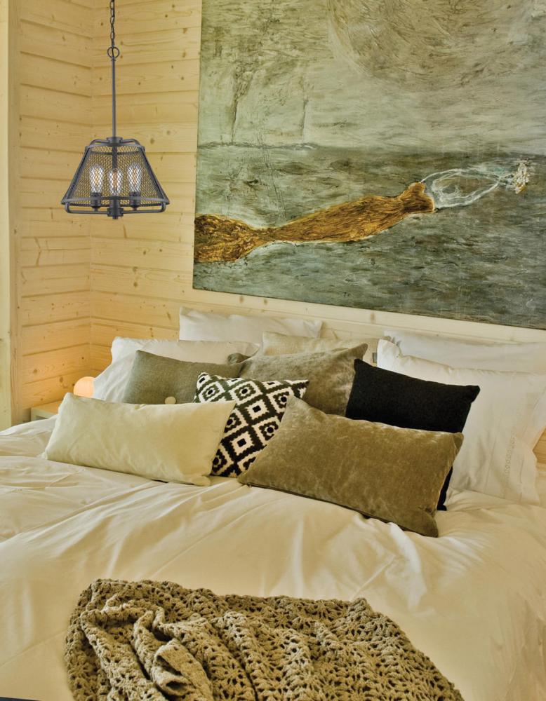 The Iuka collection of fixtures feature a round inverted mesh basket resting on a trapezoid shaped frame to create its signature look. Finishes include Bronze or Brushed Nickel.
