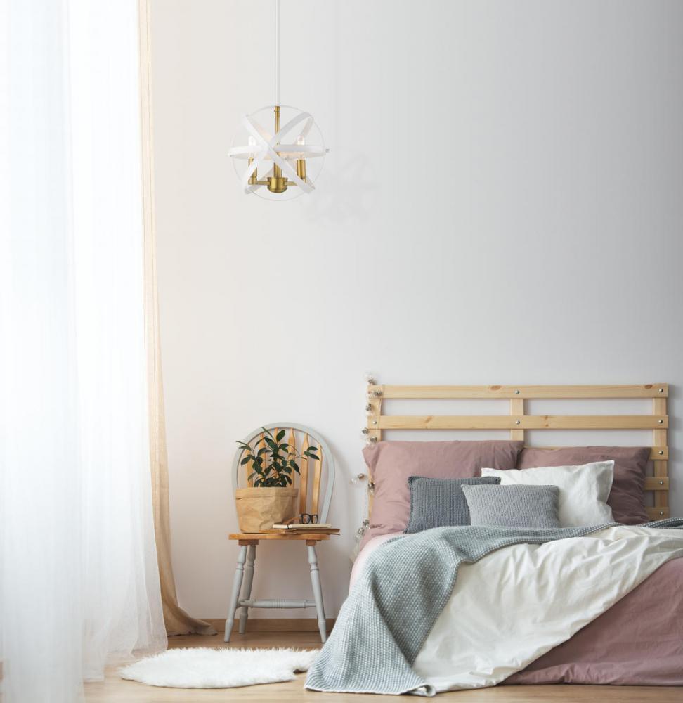 This hammered white and Oldee brass finish three-light pendant offers a light and airy ambiance and a perfect transitional motif with versatility. Stylish design weaves flat iron ribbons in an open orb shape that houses a collection of charming candelabra bulbs, creating a fun futuristic appeal.