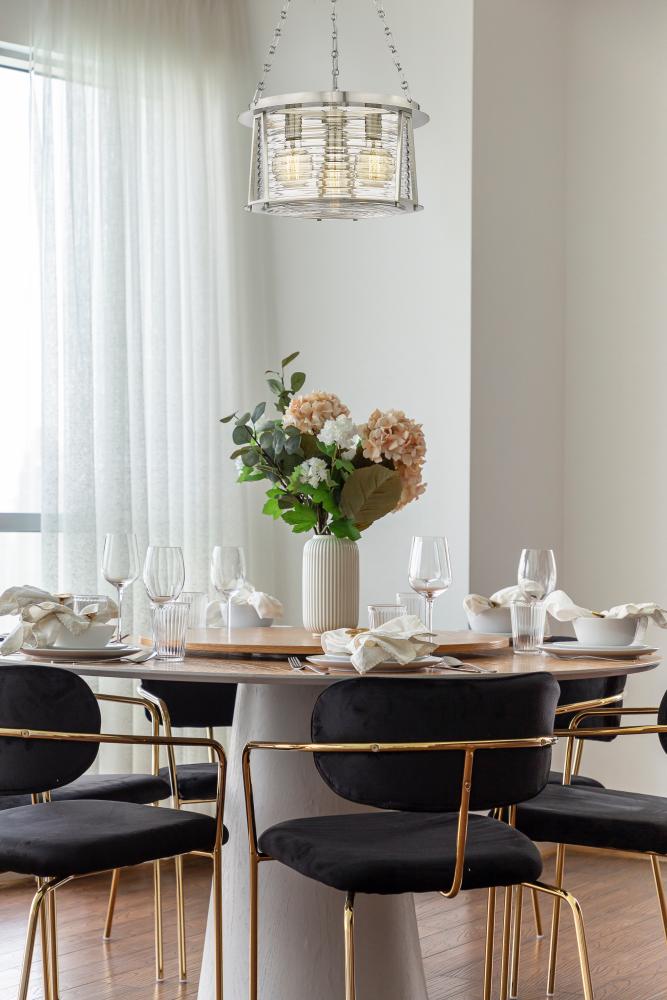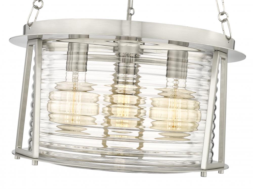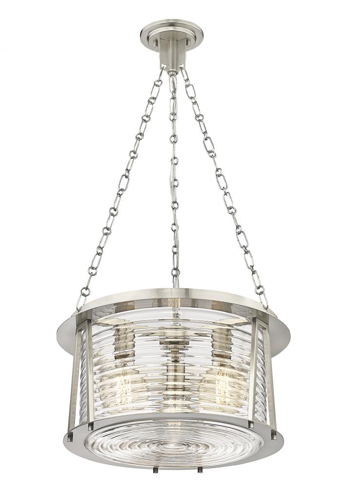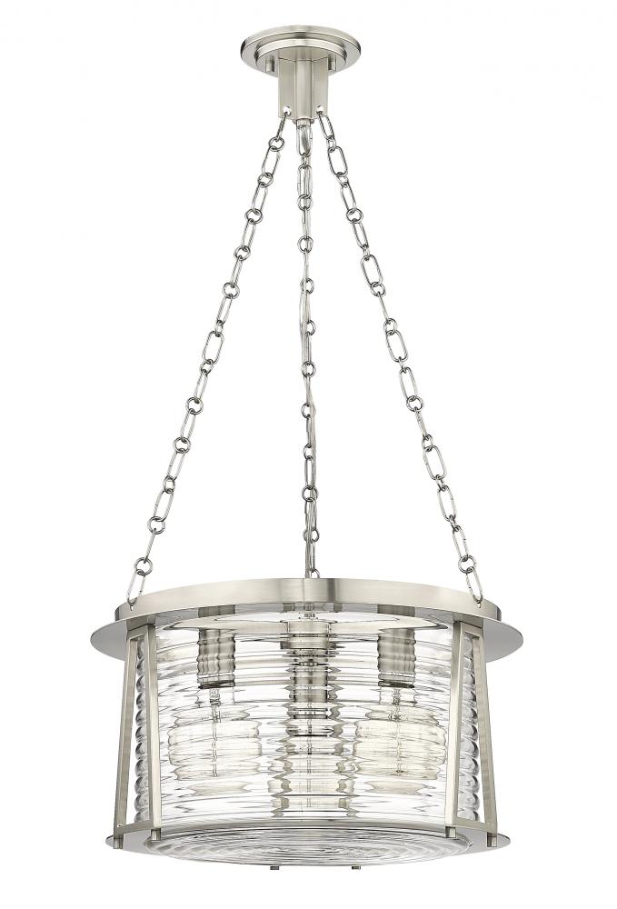 Maritime vibes reflect a sultry, heady elegance in a light fixture created for impact. Inspired by a lighthouse design, this three-light pendant from the Cape Harbor collection offers nautical elegance and artistry in one. Romantic water-hammered glass merges with brushed nickel steel framing to deliver a tasteful duo of versatility and sheer elegance ideal for a modern or transitional setting.