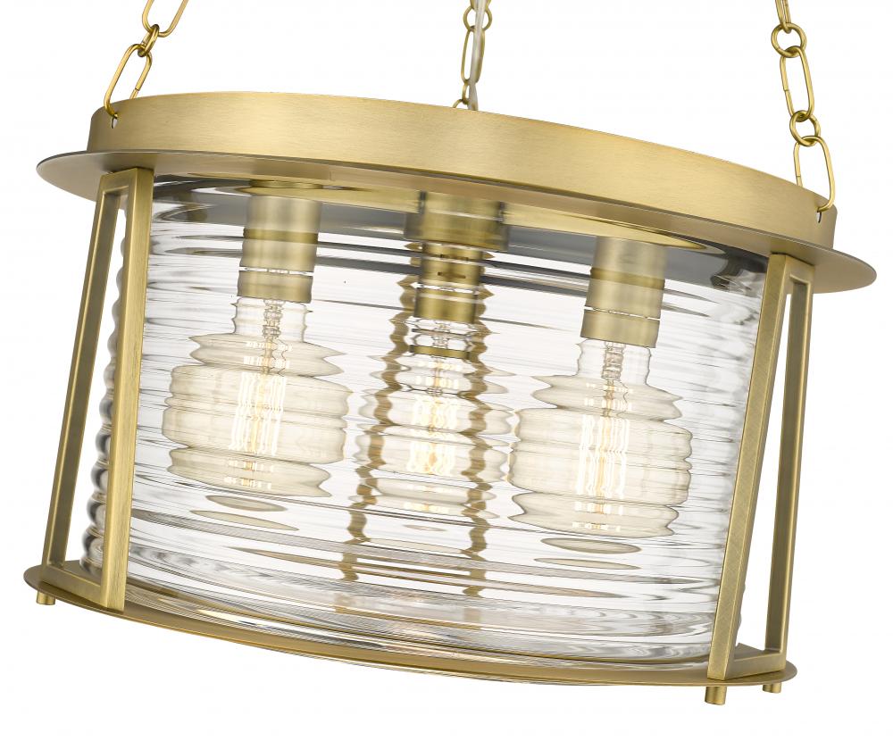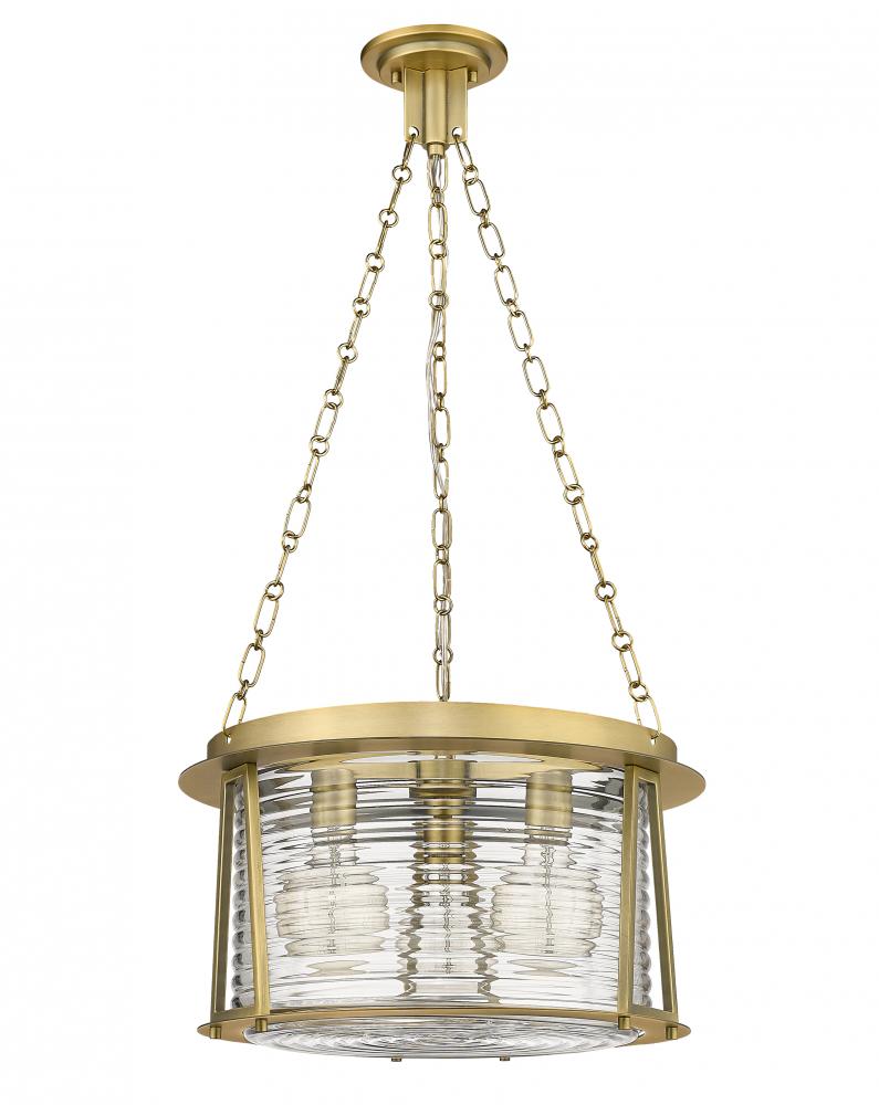 Modeling the classic artisan rendition based on a beloved lighthouse motif, this three-light pendant from the Cape Harbor collection adds head-turning elegance. Create ambient lighting in a dining or living space with a fixture suggesting industrial and coastal styles with versatility. Romantic water-hammered glass merges with lush rubbed brass finish steel framing to deliver a tasteful duo of energy and sheer decadence ideal for a modern or transitional setting.