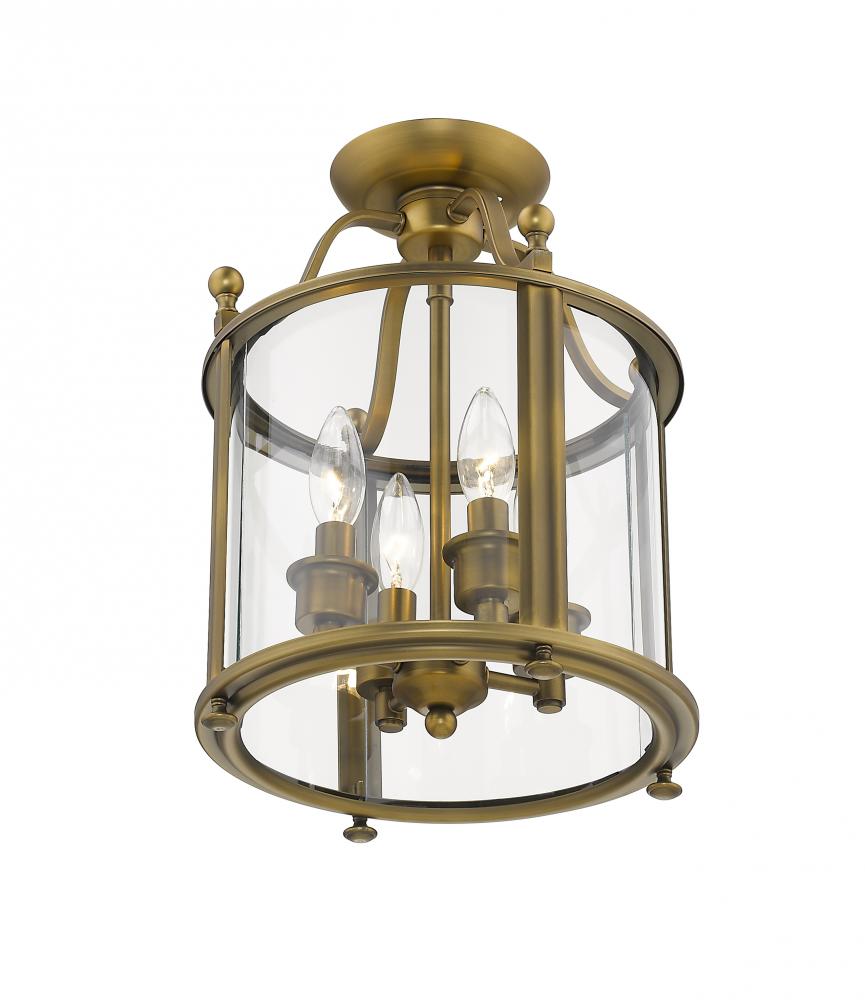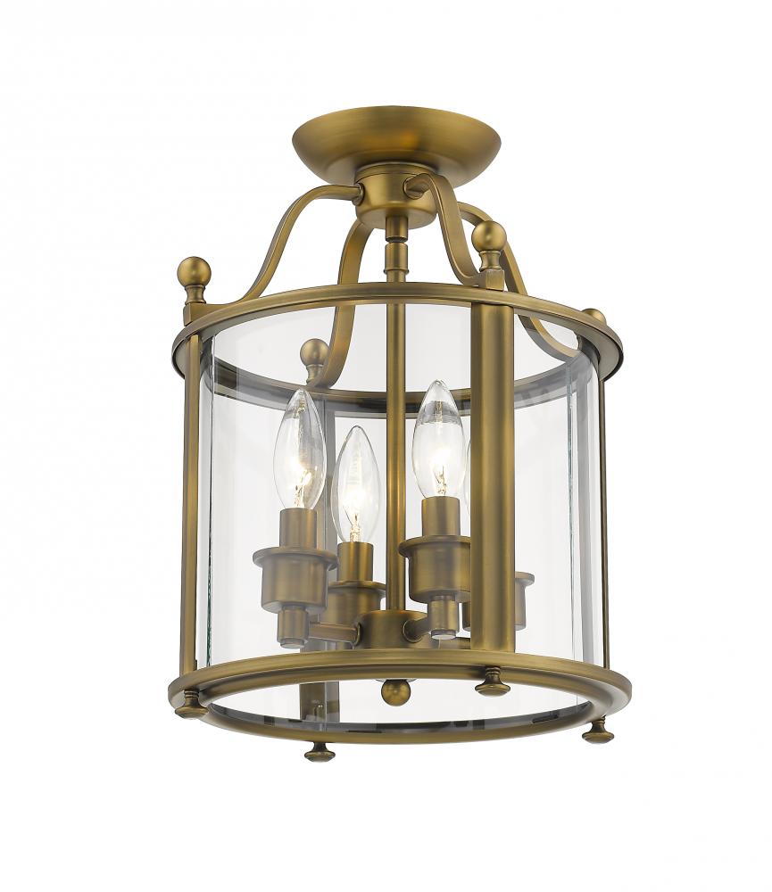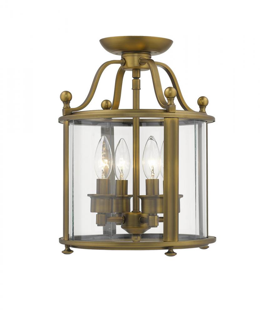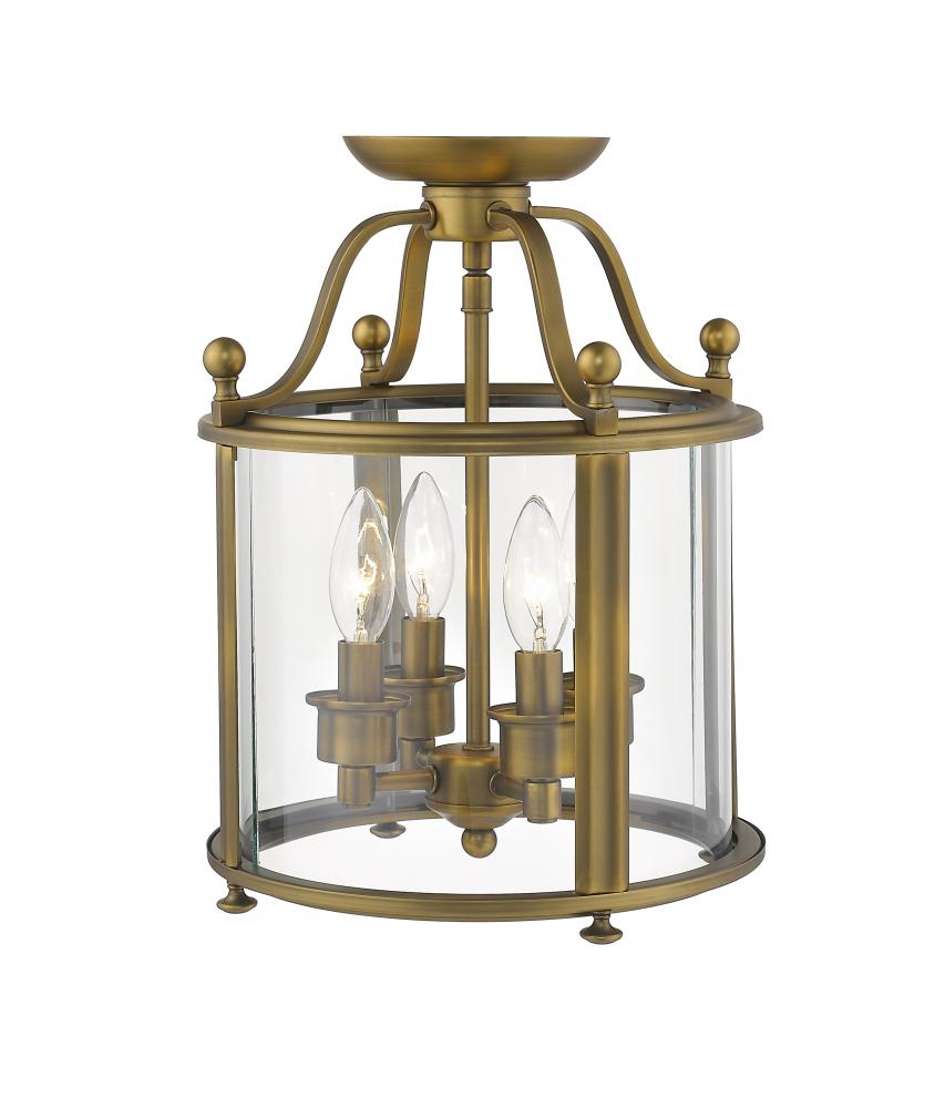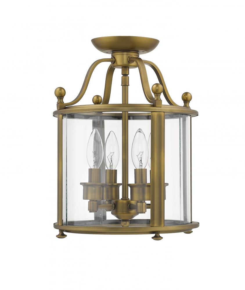 Accent a traditional living space with the rich style and inviting warmth of this four-light semi-flushmount ceiling light. Beautiful anywhere from the entry to the living room to a home office, the light features an heirloom brass finish with ball finials and a clear glass enclosure.