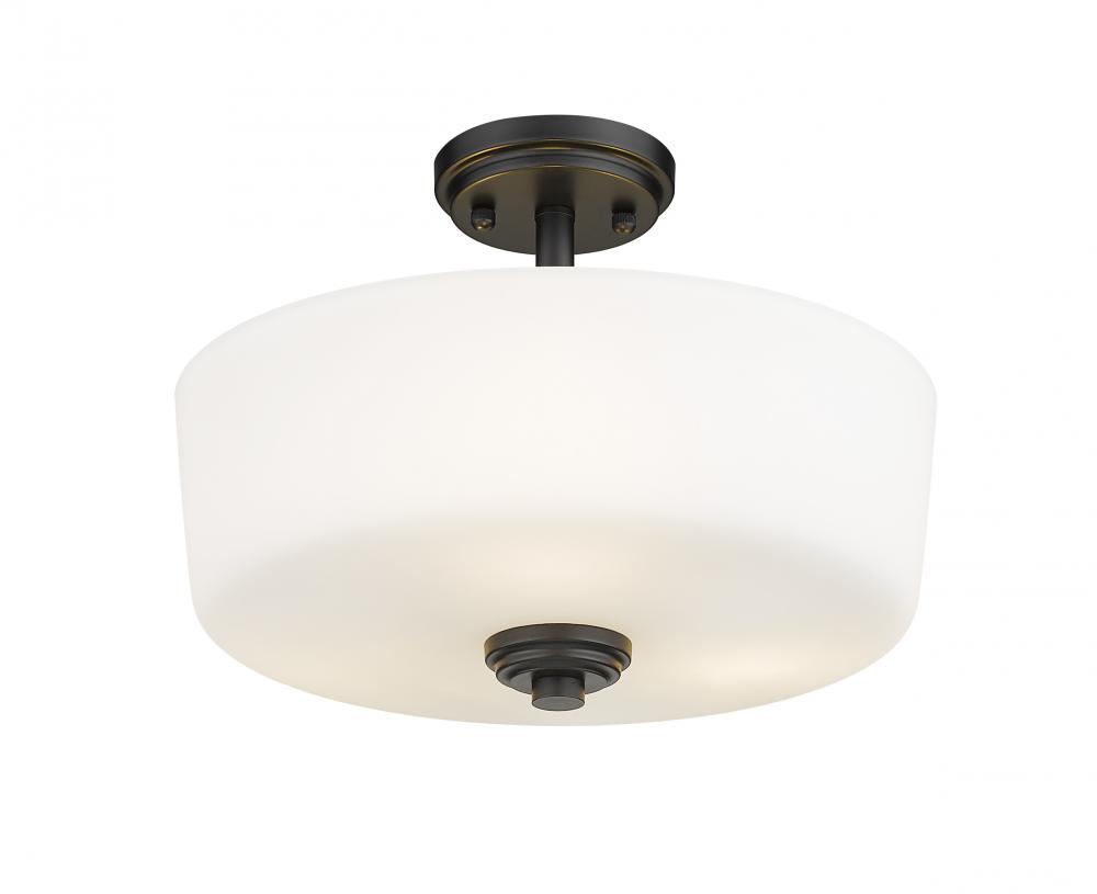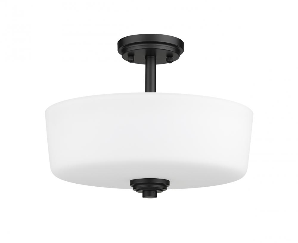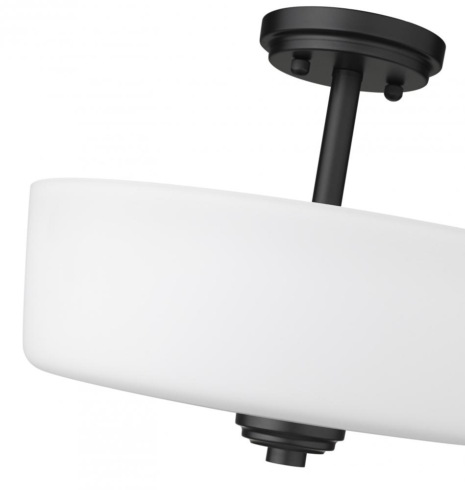 Bathe your surroundings in the graceful illumination that radiates from this three-light semi-flush mount ceiling fixture. Stylishly simple, it boasts a round, matte black frame that creates a striking contrast with its delicate, matte opal shade. This transitional ceiling light is especially ideal for a bedroom, hallway, kitchen, or living room.