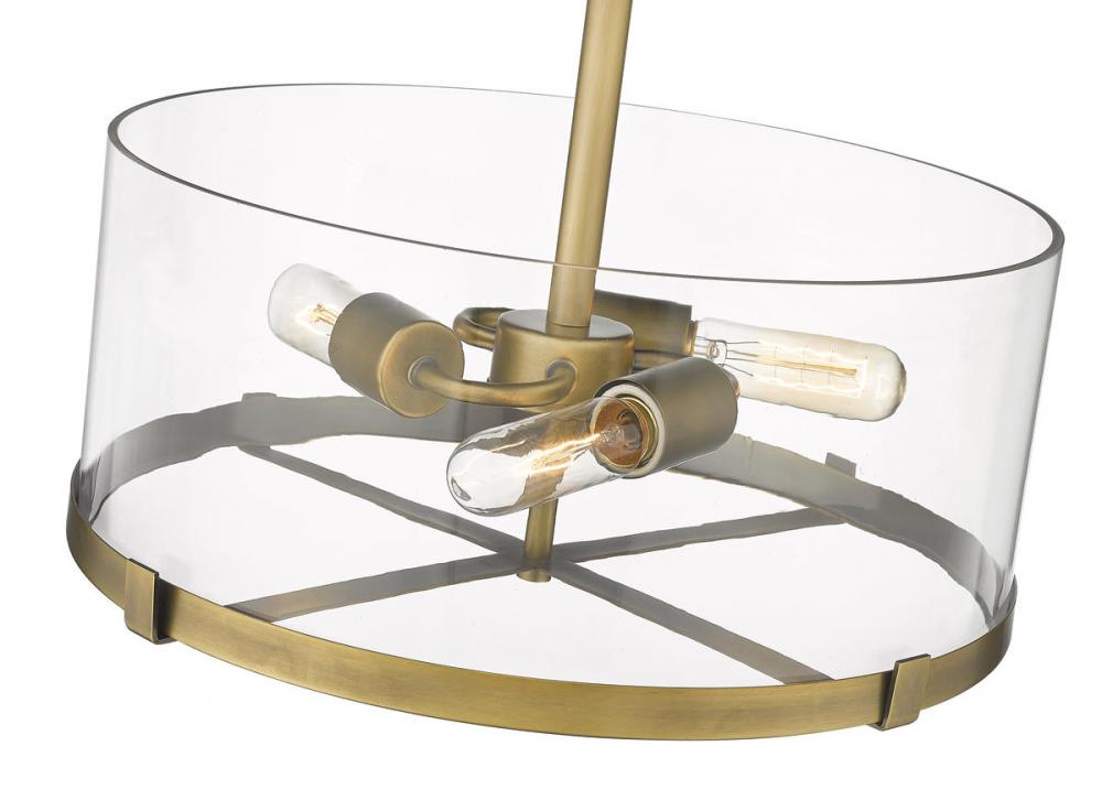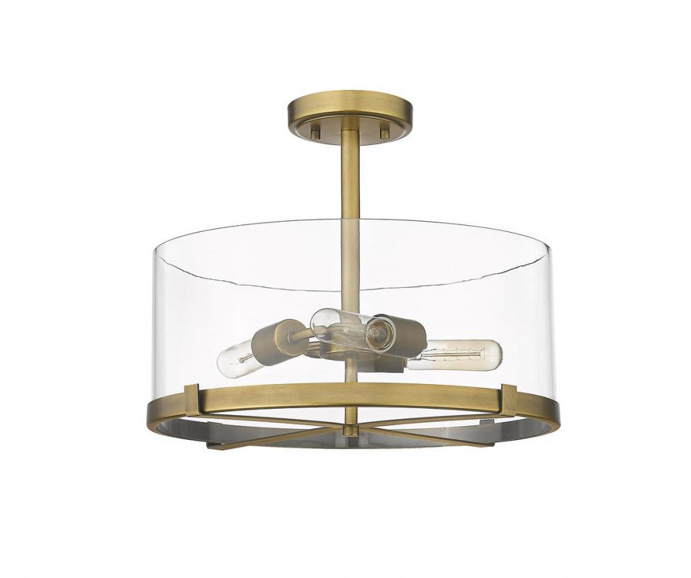 Brighten up your living environment with this classically crafted, metal and glass flush mount ceiling light. Three lights shine beneath a clear glass shade as a rich, rubbed brass frame adds warmth to the design.