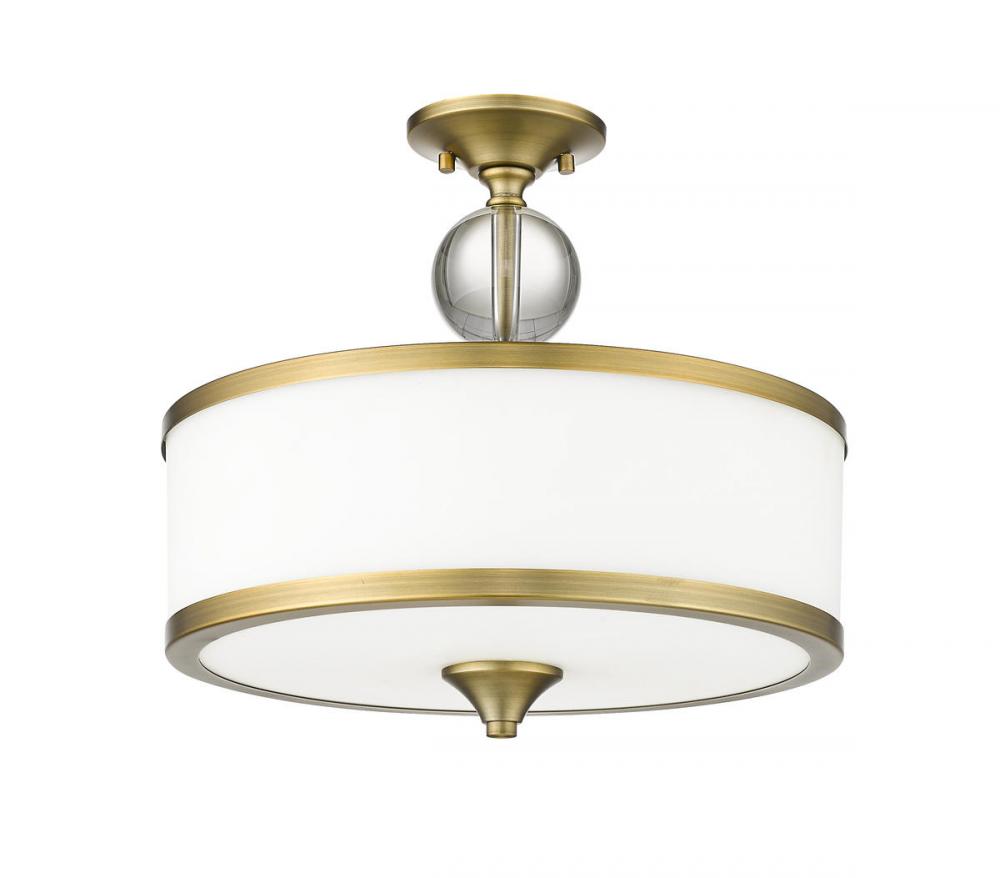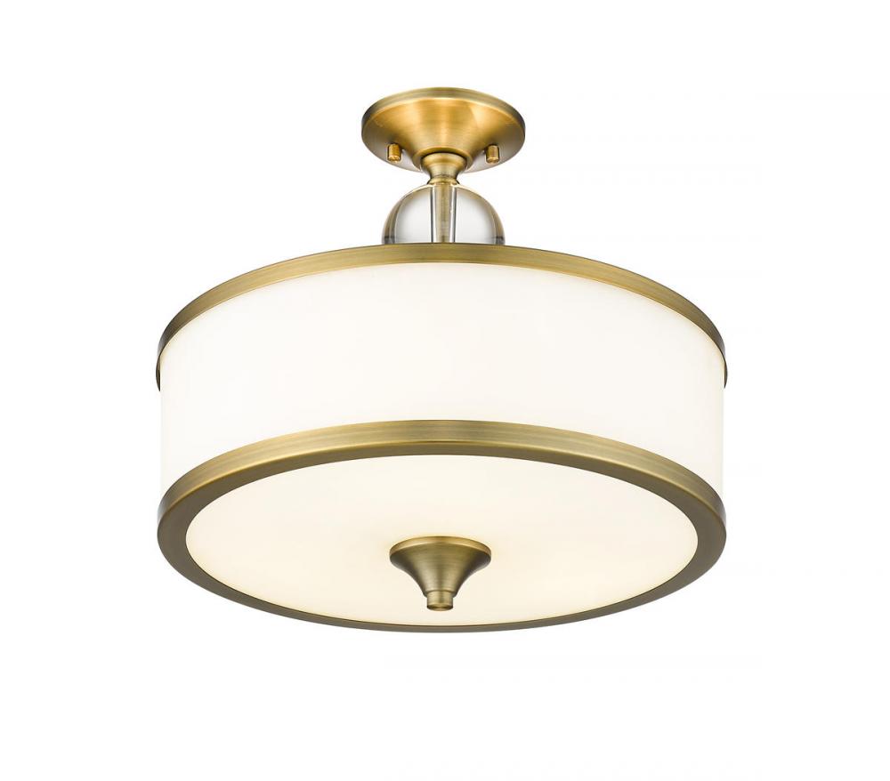 Introduce artisanal effects that stylize this three-light semi flushmount ceiling light, a modern fixture with soft, romantic flavor. This light from the Cosmopolitan collection delivers a deep etched milk white shade dressed up with heritage brass finish bands and a matching contemporary finial. Choose this light to illuminate a custom dining space, hallway, or main living area.