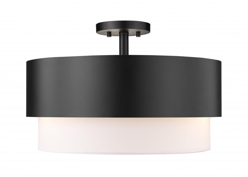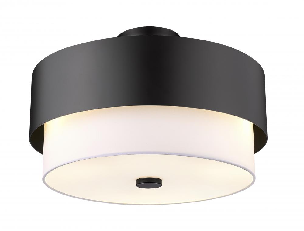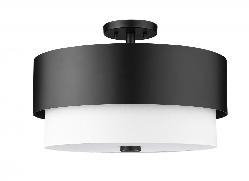 A cool contrasting finish palette starts the journey toward personality in lighting d?cor as this three-light semi-flush mount light from the Counterpoint collection offers a hybrid aesthetic of Mid-Century Modern and industrial. Embrace the matte black finish metal framing and white fabric shade of a fixture that brings a kick to a contemporary or transitional space. Ideal for dining rooms, living areas, and foyers, this circular semi-flush mount light invites an equally expressive design scheme.
