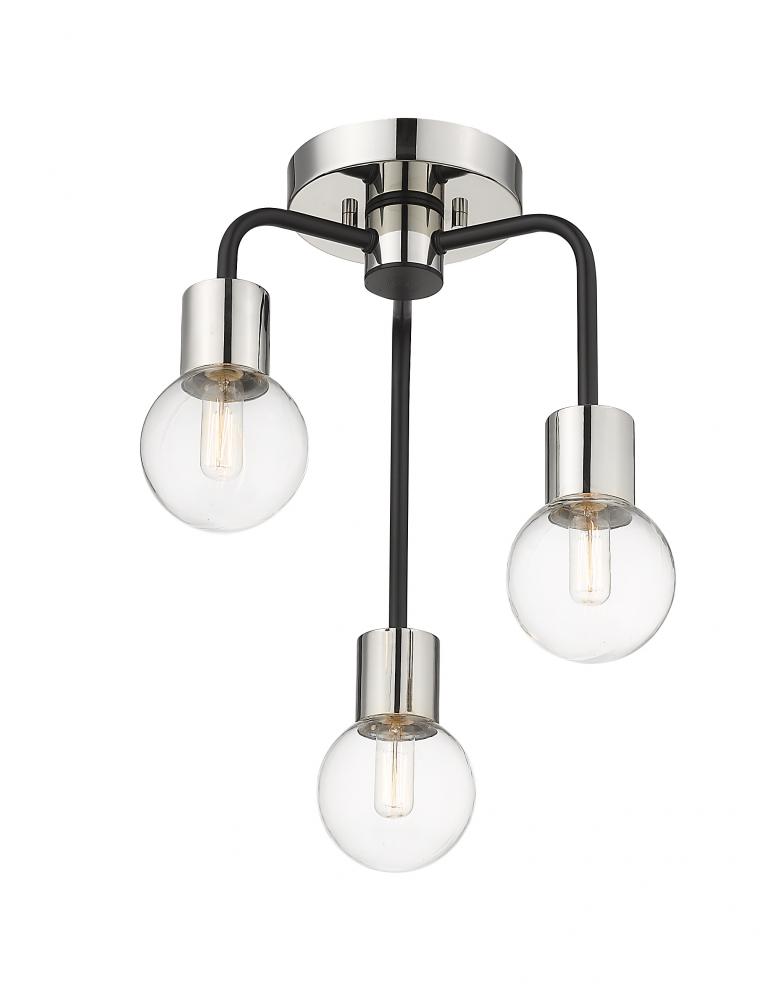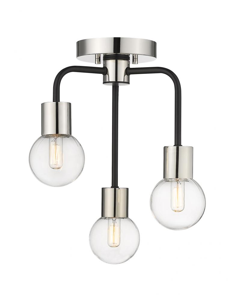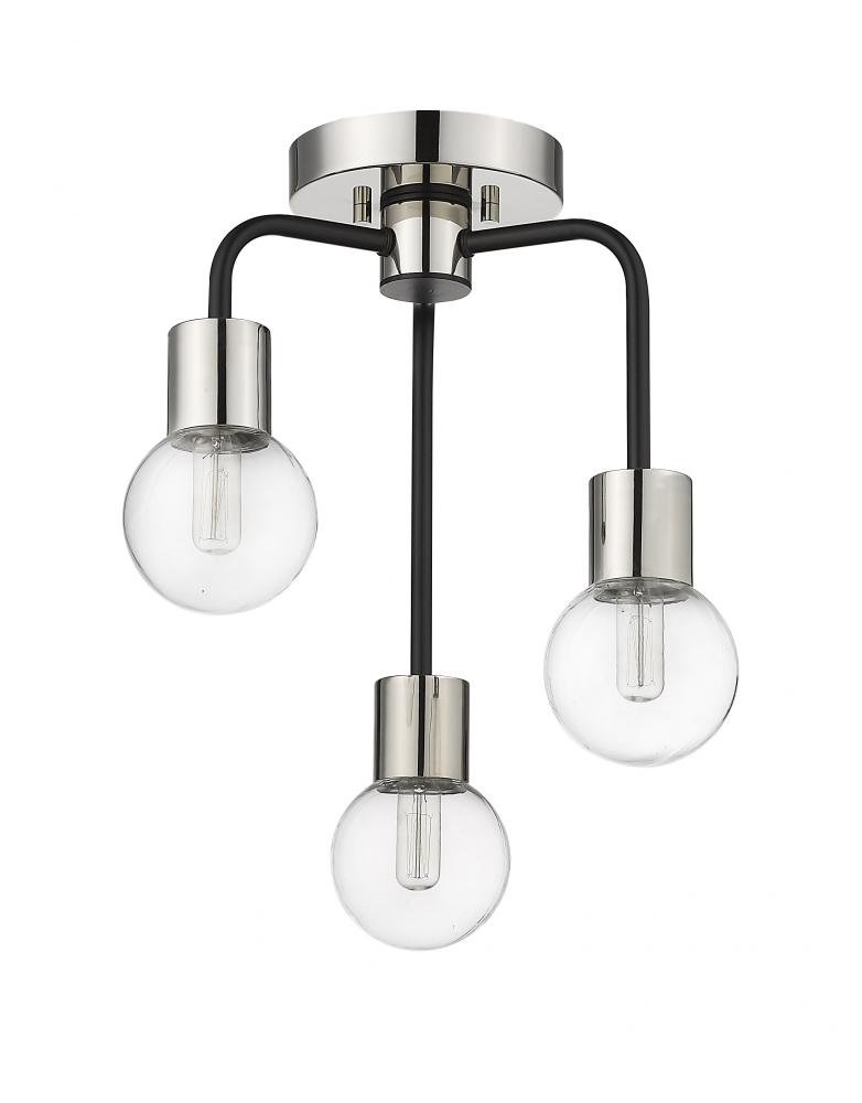 From the Neutra collection comes this exquisite semi flush mount light with three clear glass globes to illuminate a dimly lit space. Finished in a complementing two-tone design that includes arched matte black rods and a shiny polished nickel mount plate and steel fixture supports, this flush mount lighting fixture lends a vintage-inspired mid-century modern flair. Hang this drop pendant light over a dining table for an Art Deco vibe.