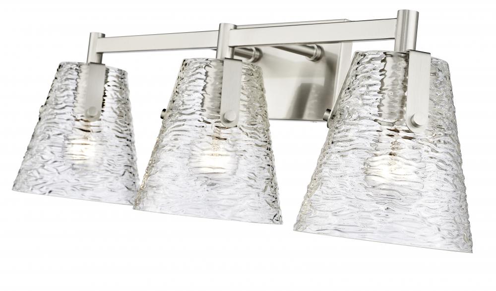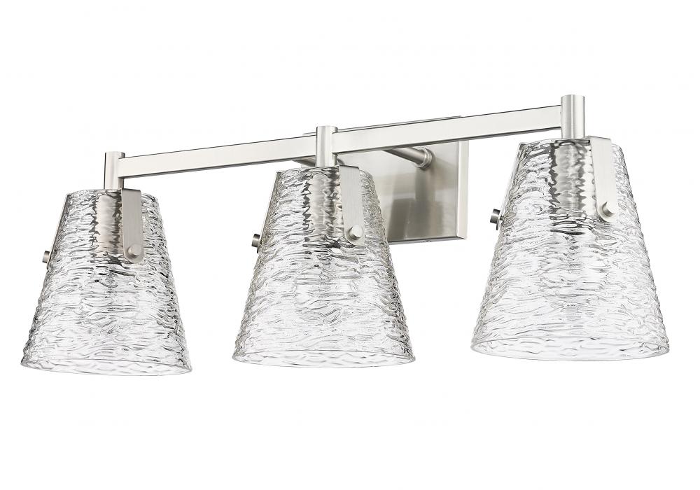 Beginning with a tastefully minimalist brushed nickel finish steel frame, this chic three-light vanity bath light is a superb choice for adding elegance and ambient lighting. Crowning a custom vanity, this fixture from the Analia collection brings a bit of nautical charm with a trio of conical shades fashioned of clear textured glass. Choose this three-light vanity light to dress up a contemporary or transitional ensuite or guest bath.