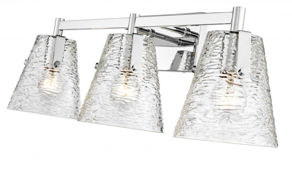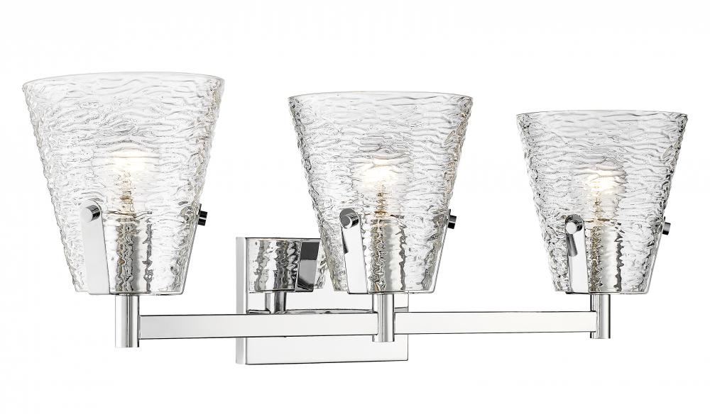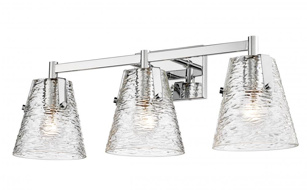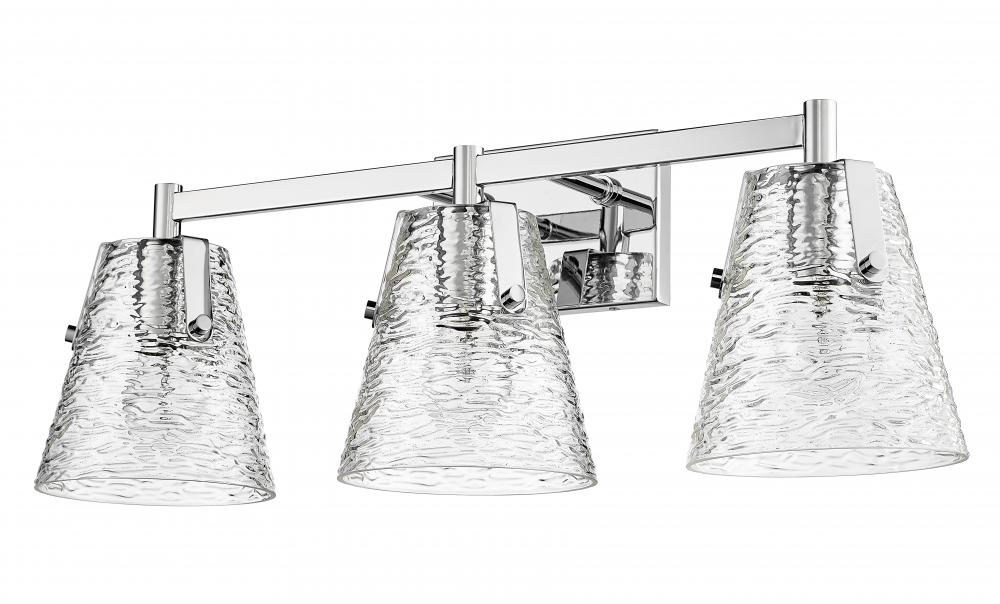 A gleaming chrome finish steel frame shapes this chic three-light vanity bath light, a superb choice for adding elegance and ambient lighting. Crowning a custom vanity, this fixture from the Analia collection brings a bit of nautical charm with a trio of conical shades fashioned of clear textured glass. Choose this three-light vanity light to dress up a contemporary or transitional ensuite or guest bath.
