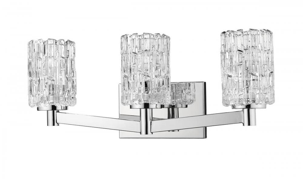 A contemporary haven is bejeweled with glam as this exquisite three-light vanity light becomes a focal point highlighting a compact vanity. Crystal-like glass shades add an air of exclusivity to a fixture with a sleek Chrome finish metal mount and arms, and an air of high-class, upscale elegance.