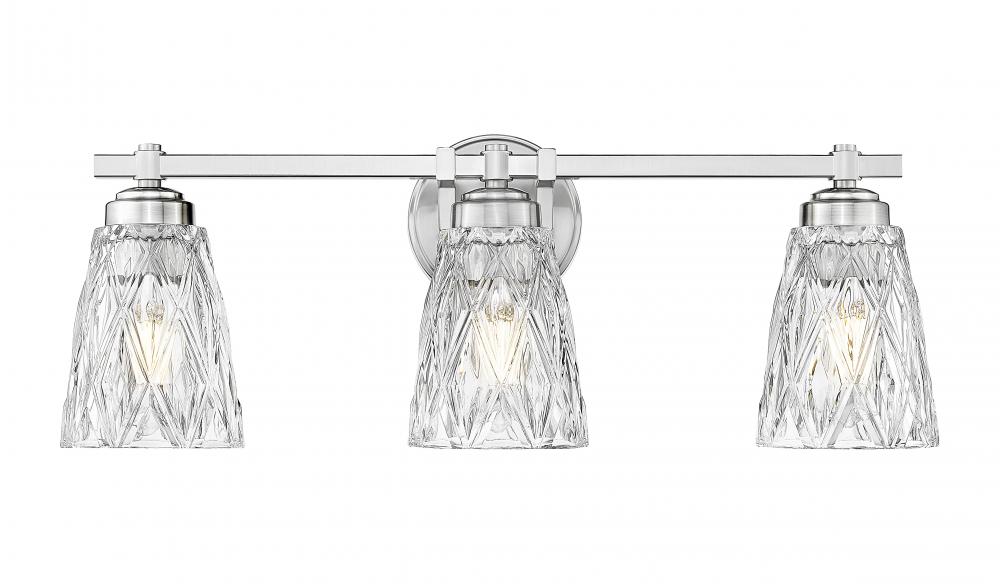 With textural elegance and a classic design, this three-light vanity light is a superb choice for delivering glam to master or guest bath spaces. Subtle detail embellishes linear and circular framing featuring brushed nickel metal, with overlapping diamond patterning impact light effects as it glows through clear glass conical shades. This dimmable fixture offers customized light levels.
