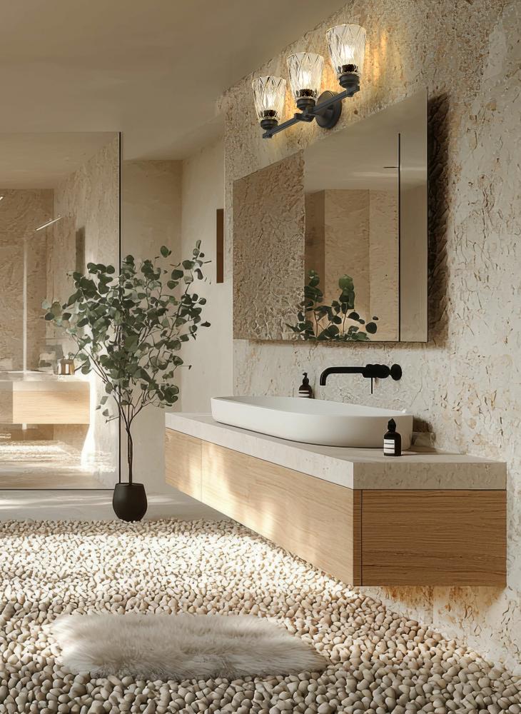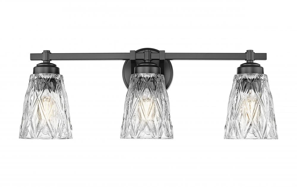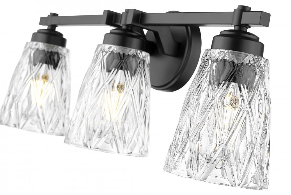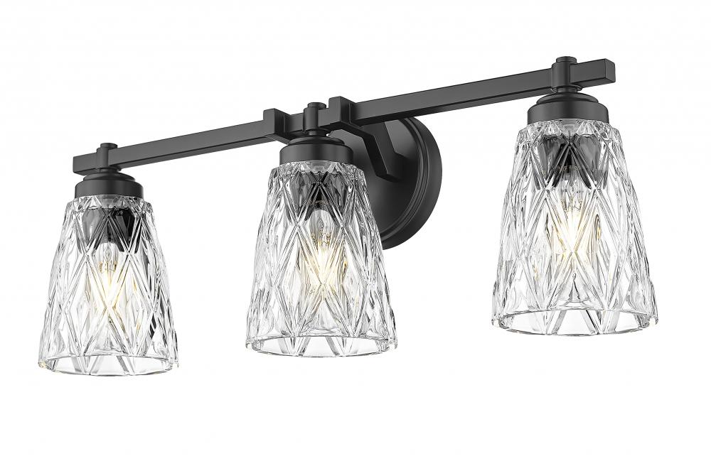 Bold matte black finish metal framing offers a sleek contrast as this glass and metal three-light vanity light provides a timeless yet glam-inspired motif. Master and guest bath settings welcome plenty of ambient lighting flowing through textural overlapping diamond patterning on clear glass conical shades, matching the exquisite flavor of a custom bath design. Enjoy dimming functions that deliver variable light levels as needed.