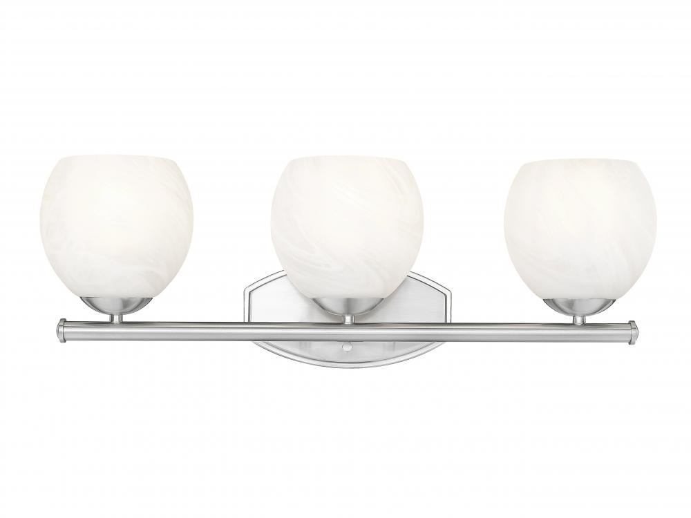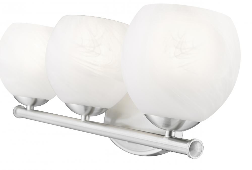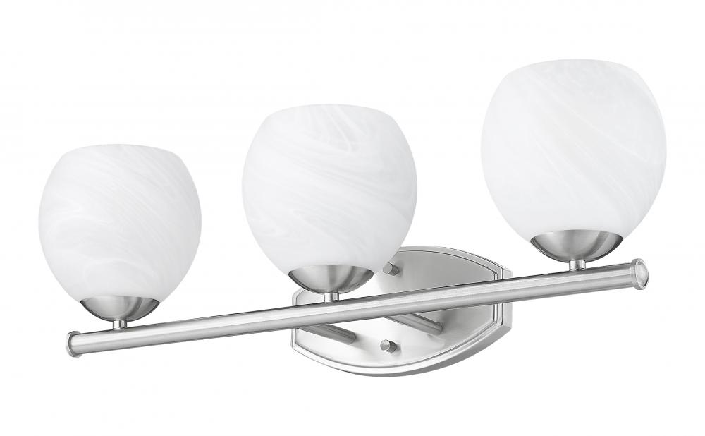 Bright illumination radiates from the trio of feathered opaque white swirl glass shades perched on this transitional three-light vanity bath fixture. An impeccable addition over your countertop, it features a brushed nickel finish that lends timeless elegance. Graceful curves define its wall plate, while a straight bar is clean and precise for a crisp, engaging look that elevates without overwhelming.