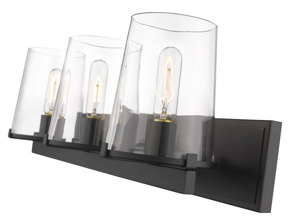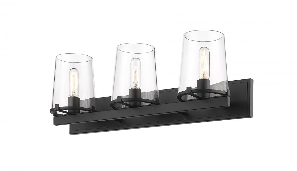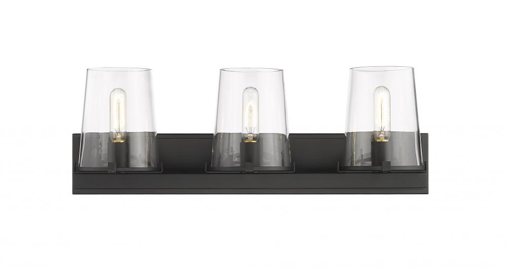 The Callista three-light vanity light repurposes a classic bath space into a gallery-inspired spot where chic design elements prosper. This fixture offers a linear design with a hand-crafted rectangular frame and wall mount crafted of matte black finish steel. Wrapped up with a trio of delicate tapered clear glass shades, the Callista vanity light embellishes a custom vanity with exceptional sophistication.