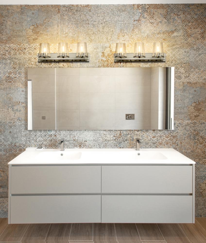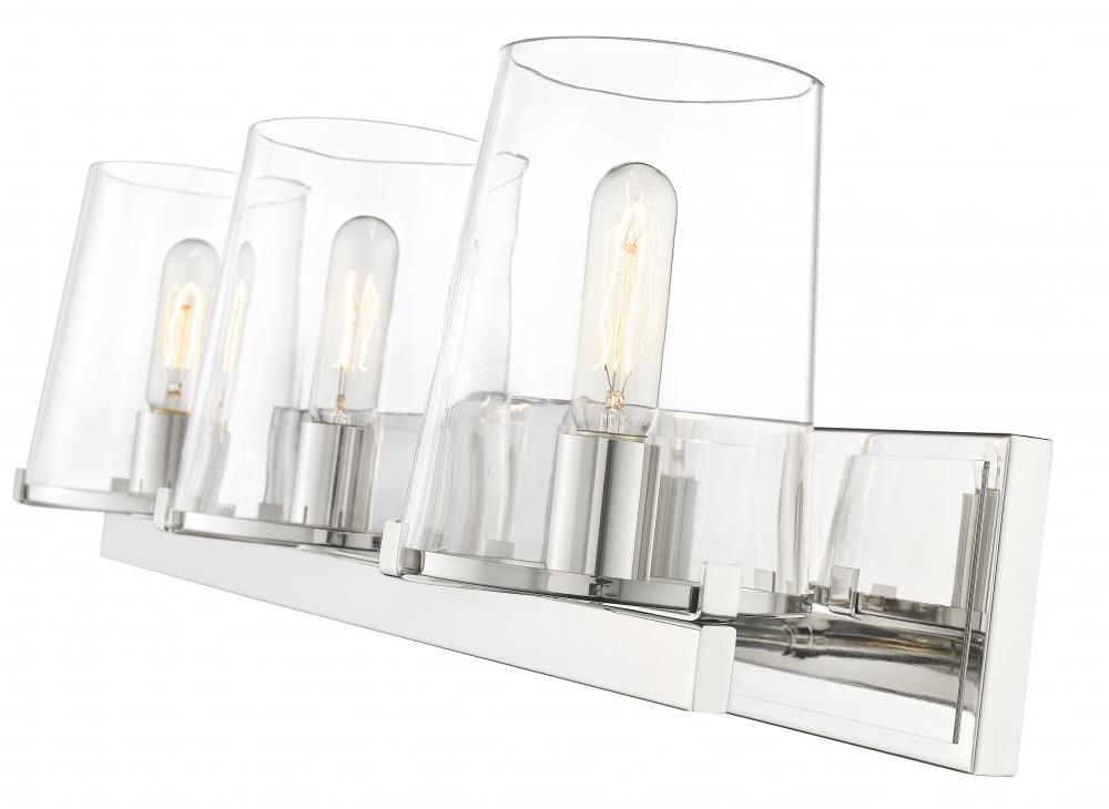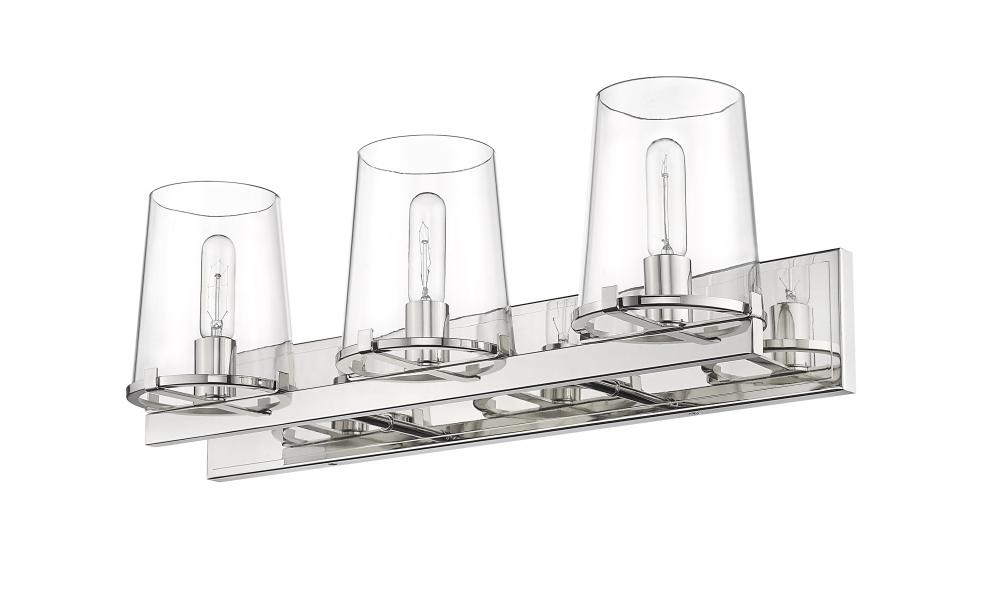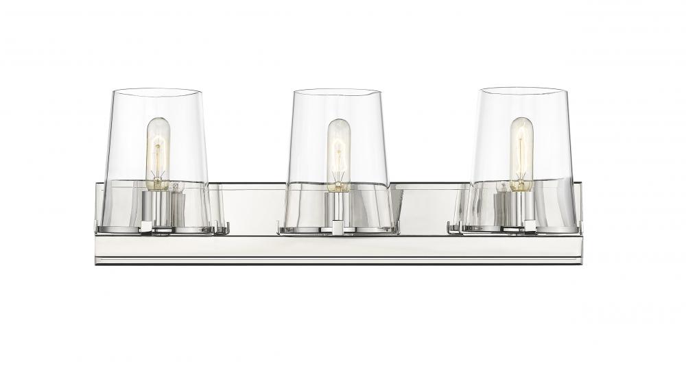 Outfit a transitional bath space with the Callista three-light vanity light and watch the magic transformation evolve. This fixture offers a linear design with a hand-crafted rectangular frame and wall mount crafted of gleaming polished nickel finish steel. Wrapped up with a trio of delicate tapered clear glass shades, the Callista vanity light embellishes a custom vanity with exceptional sophistication.