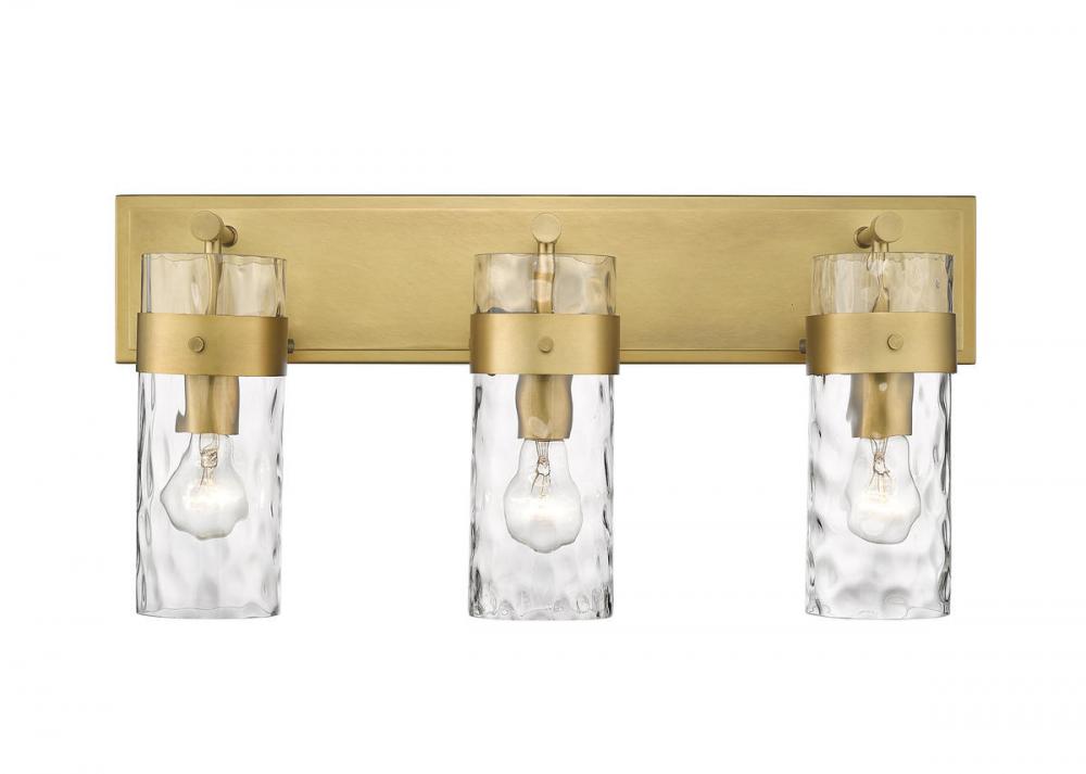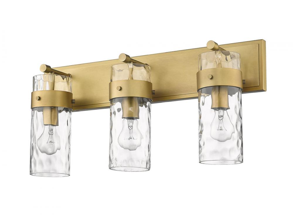 Equal parts stylish and functional, this three-light vanity fixture is alluring. The cylindrical glass shade is accented with a ripple texture in a romantic design. Steel construction in a rubbed brass finish allows it to pair with many types of decor ranging from farmhouse to modern.