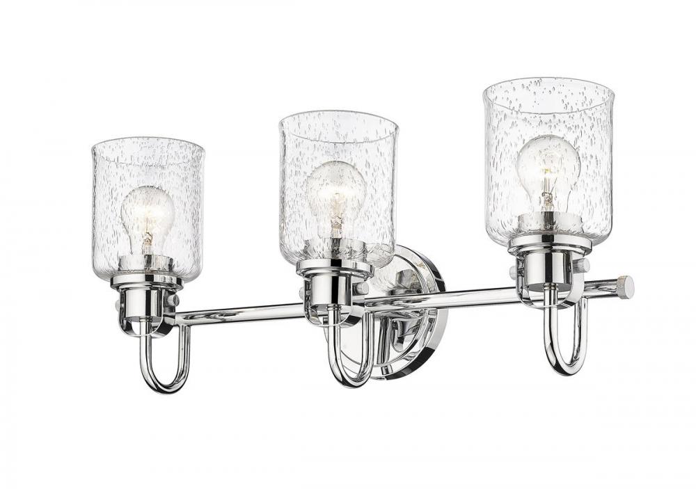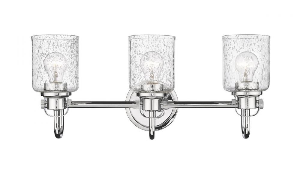 This urban three-light vanity fixture is made from steel, seeded glass, and finished in chrome for a metropolitan allure. It provides a lovely glow in any bedroom or bathroom.