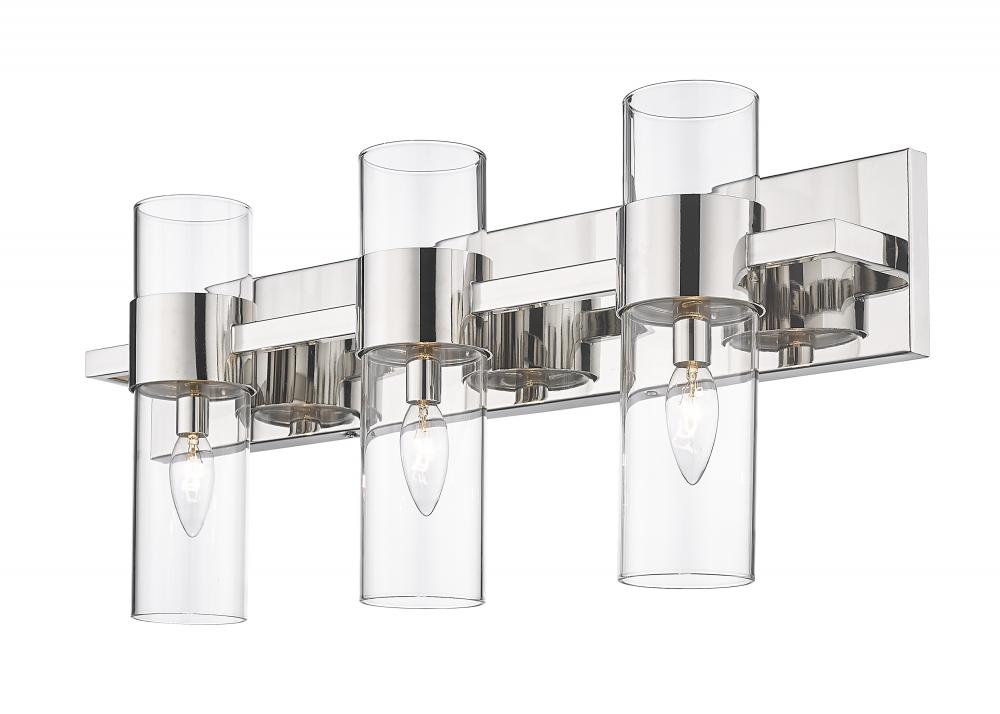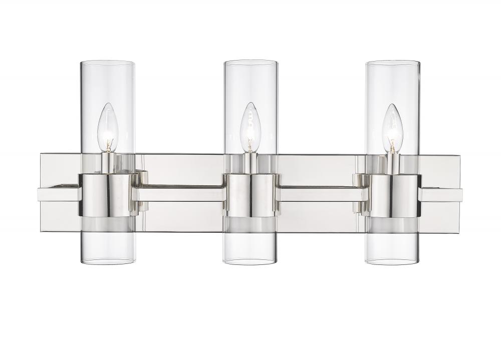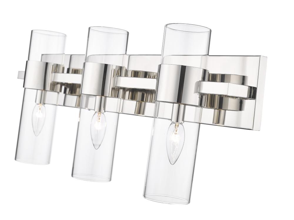 Minimalist modern style carries through in this chic linear contemporary vanity light, transforming en suite bathrooms and spacious powder room into a sleek and restful retreat. An elongated steel plate suspends three lantern-like clear glass cylinder shades, each held in place by a wide polished nickel ring that adds a glamorous metallic touch. Mirror existing bathroom hardware and fixtures and create substantial illumination with this three-light vanity light, mounting it above a decorative bathroom mirror over a countertop or dressing area.