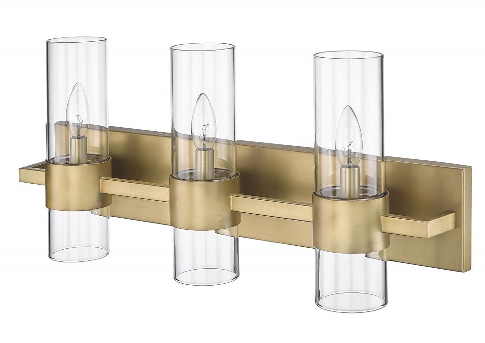 Minimalist modern style carries through in this chic linear contemporary vanity light, transforming en suite bathrooms and spacious powder room into a sleek and restful retreat. An elongated steel plate suspends three lantern-like clear glass cylinder shades, each held in place by a wide rubbed brass ring that adds a luxurious warm metallic touch. Mirror existing bathroom hardware and fixtures and create substantial illumination with this three-light vanity light, mounting it above a decorative bathroom mirror over a countertop or dressing area.