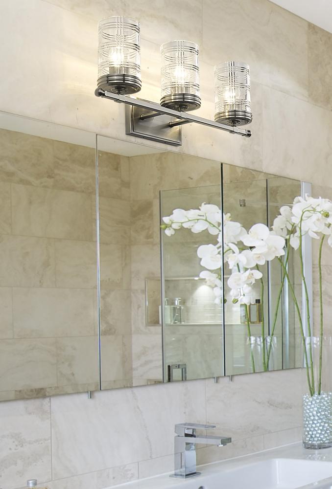 Elevate a traditional-leaning master bathroom with this elegant classically designed transitional three-light vanity wall sconce. Three cut crystal-inspired cylinder glass shade offers an old-world restoration feel with a handsome Glen plaid pattern, projecting a scintillated effect across countertops and vanities. A shiny brushed nickel finish throughout offers a cool metallic tone, lending a metropolitan glam touch to this three-light wall sconce, making it a perfect addition to spacious double vanities.