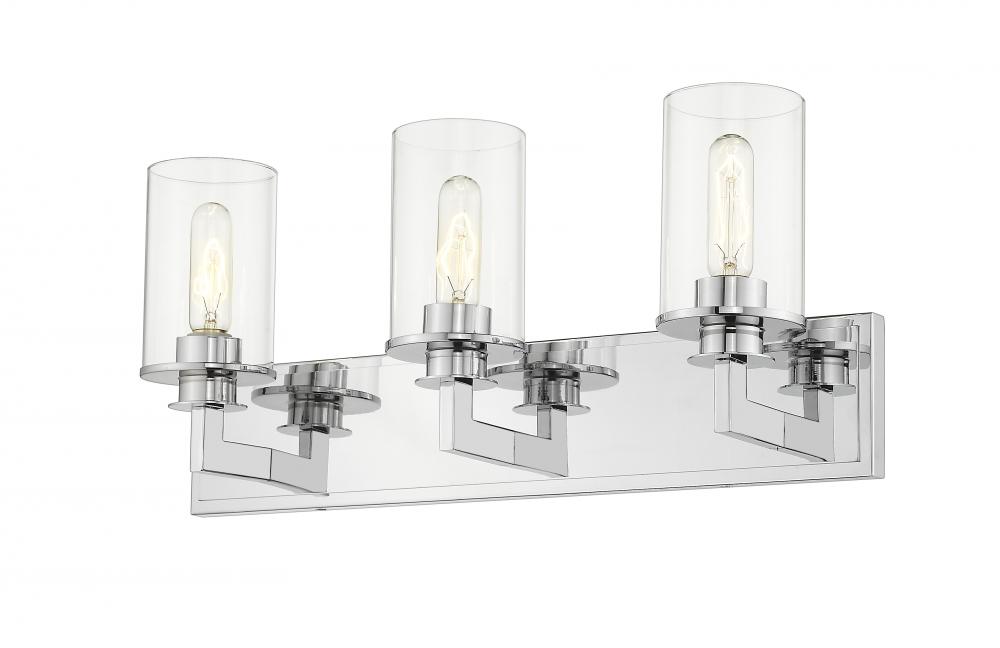 Audaciously stylish with slim angled lines, this mid-century modern three-light vanity is the epitome of elegance. A shiny chrome finish underscores the stunning brightness of the clear glass cylinder-shaped shades.