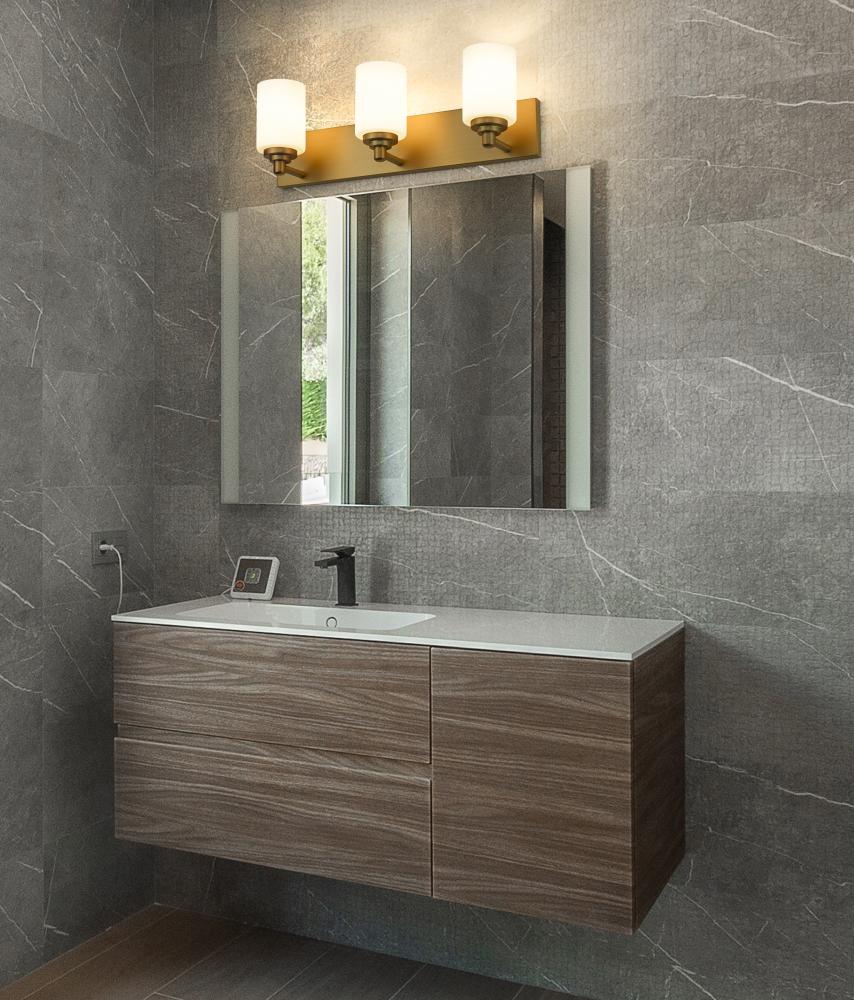 Exploring a tasteful form of minimalism, this three-light vanity light brings a classic example of upscale design. From the Soledad collection, this fixture features a straightforward silhouette with warm brushed gold finish steel serving as a rectangular wall plate and holder, and three side-by-side chic cylinder shades made of delicate white glass. This vanity light may be mounted facing up or down in an en suite or guest bath space.