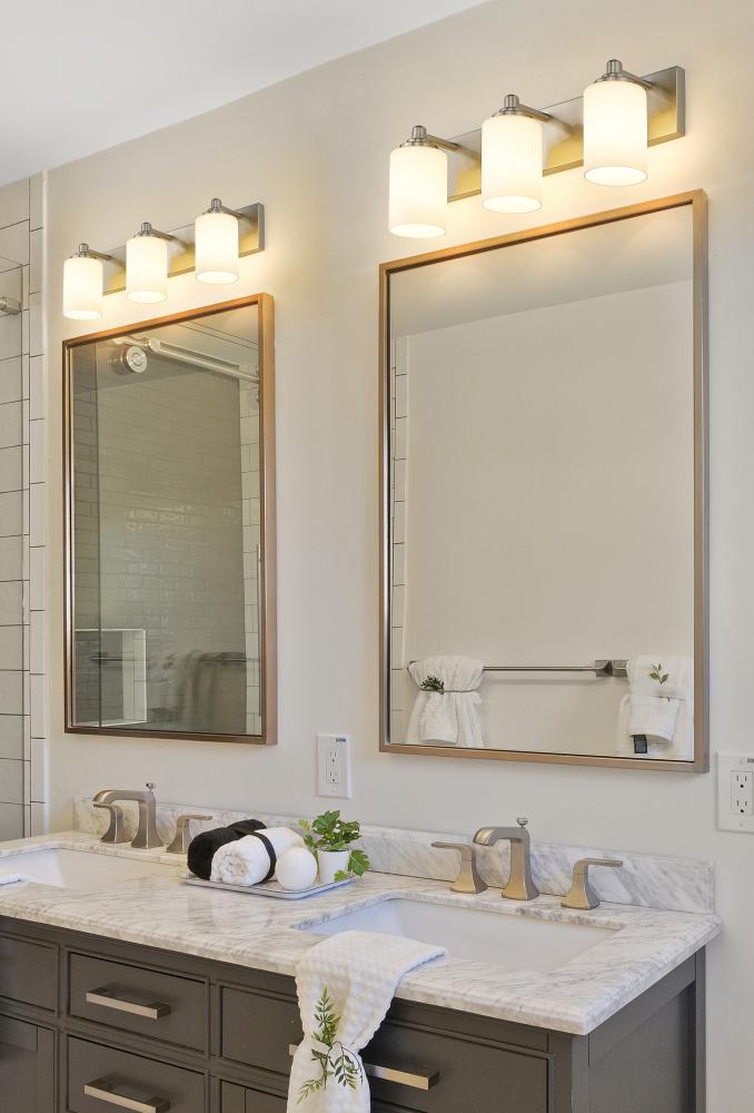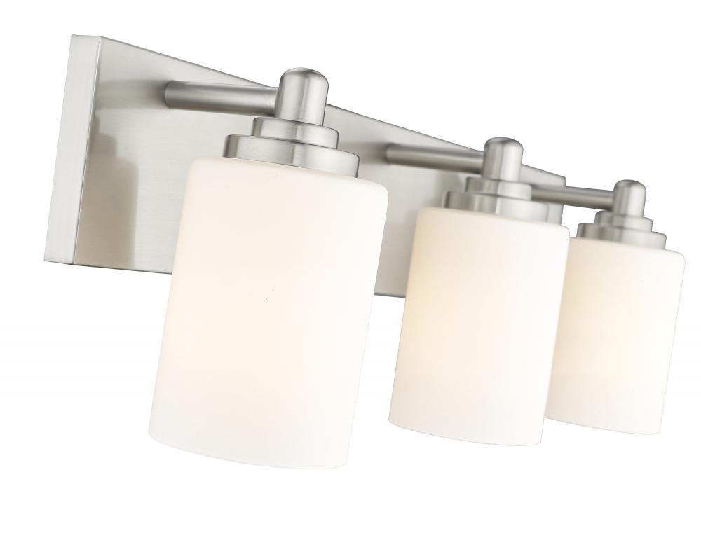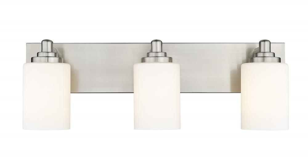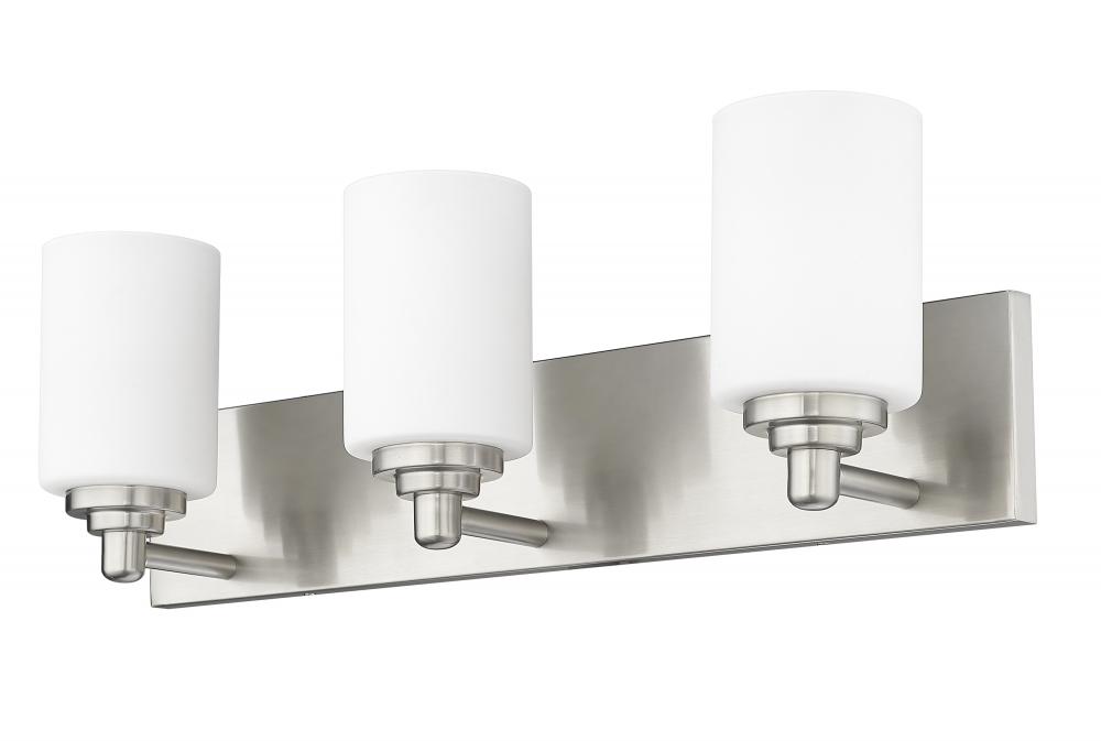 Embellish a sophisticated look of classic style highlighting a bath vanity with this three-light vanity light. From the Soledad collection, this tasteful fixture features a minimalist silhouette with brushed nickel finish steel serving as a rectangular wall plate and holder, and three side-by-side chic cylinder shades made of delicate white glass. This fixture may be mounted facing up or down in an en suite or guest bath space.