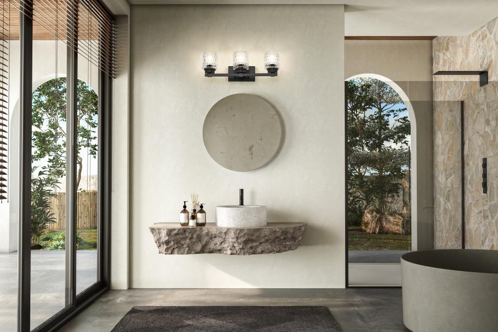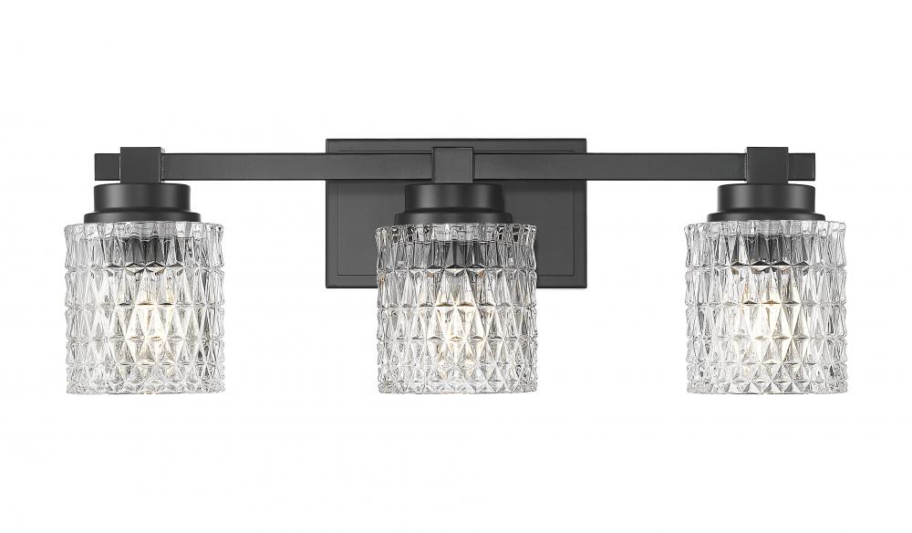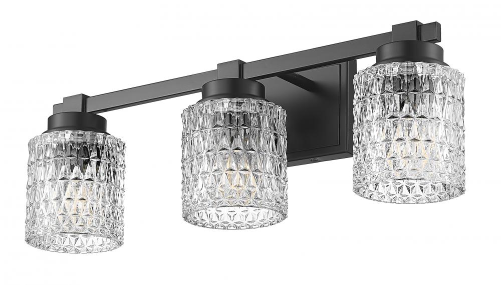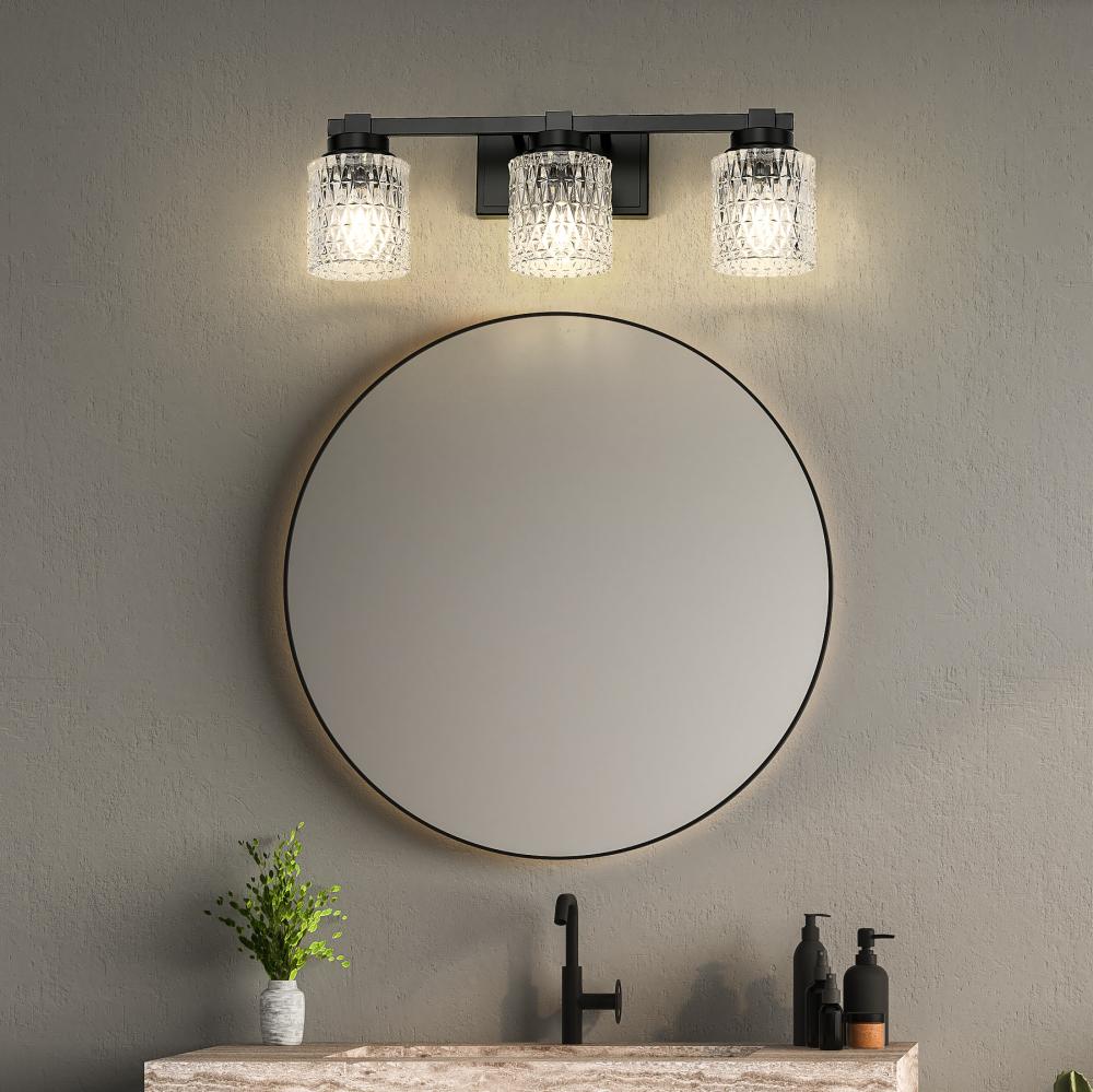 Master and guest bath spaces all crave tasteful sophistication in d?cor, and this three-light vanity light delivers. With tasteful and subtle detail enriching its matte black finish steel framing, its dynamic look is evident, embellished with scintillating diamond patterning adding texture to clear glass shades. Dimming features expand the appeal of this fixture.
