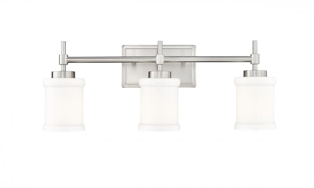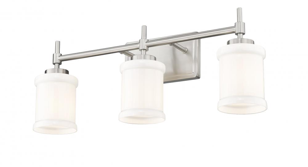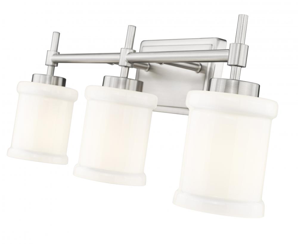 A trio of lights are embellished with glossy white opal glass shades that add cuffs at the top and bottom, creating the perfect dose of dimension. This modern vanity light is perfect for a contemporary space, creating bright, diffused illumination while displaying clean lines and a lovely brushed nickel finish.