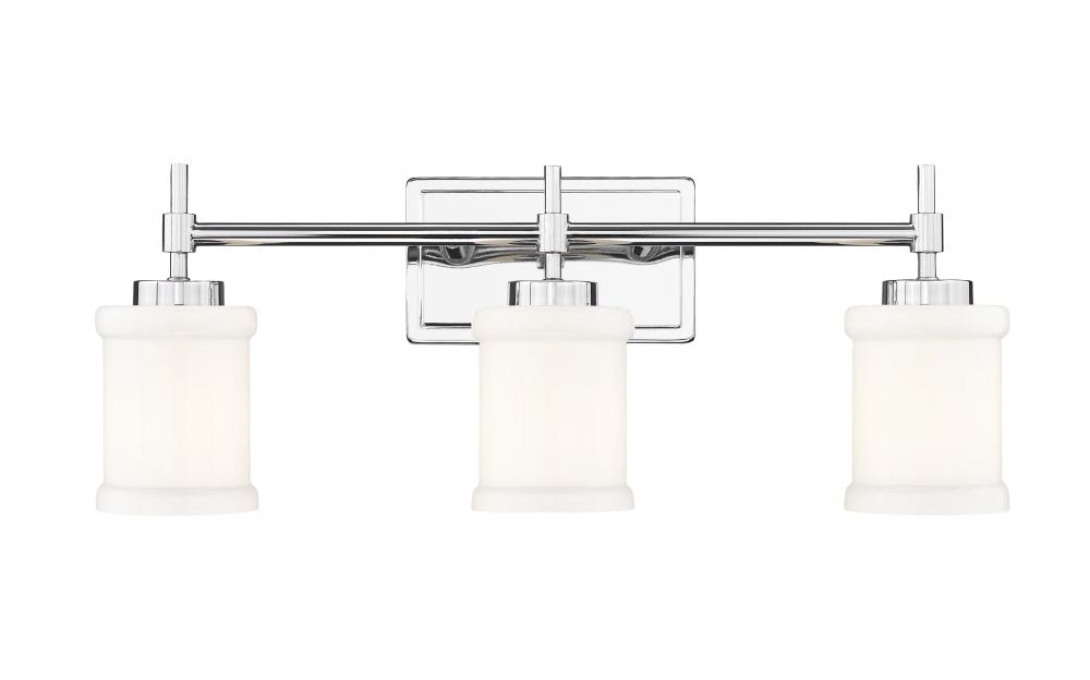 Gleaming chrome adds dimensionality to the textural accents featured on a modern three-light vanity fixture. Impressive in its attention to detail, it boasts a trimmed wall plate paired with decorative arms that bring exceptional character. A trio cylindrical shades are crafted in glossy white glass with cuffed accents, delivering exquisite style and beautiful illumination.