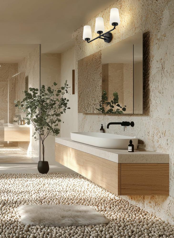 The cool matte black finish and soft opal glass of this modern three-light vanity wall light create striking contrast and depth. Perfect for your primary or guest vanity, it casts bright, diffused illumination through tall, tapering shades and allows a choice of lights pointing up or down to best suit every space. A simple, clean silhouette enhances a variety of decors, from contemporary to industrial to restoration.