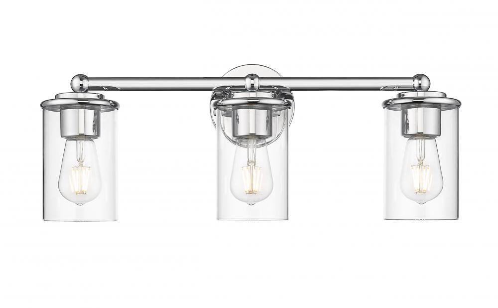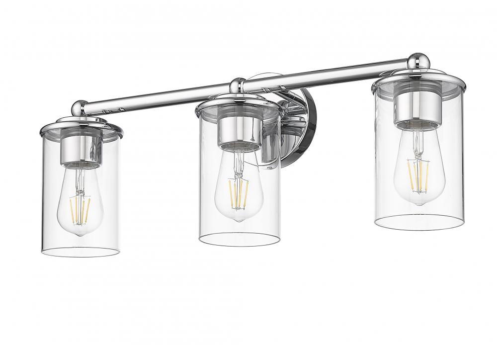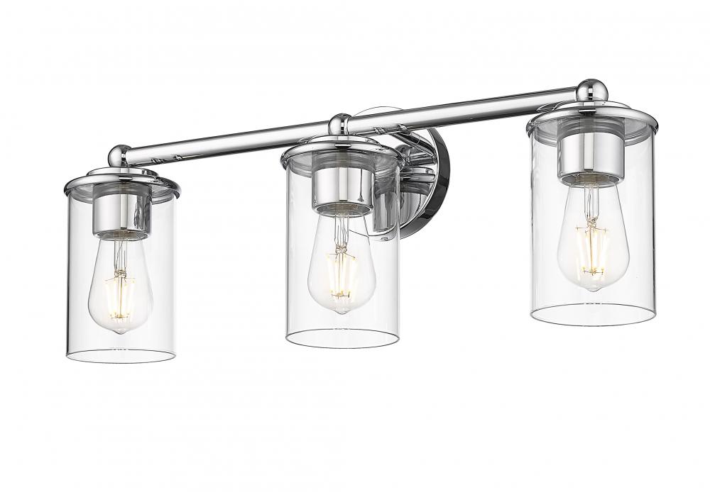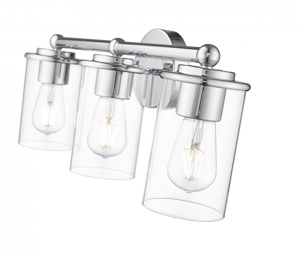 Smooth curves and understated design collide to create a striking silhouette for a Thayer modern three-light vanity fixture. Beautiful over a sink or brightening a free-standing vanity, this gorgeous fixture features a chic chrome finish paired with clear glass that provides bright, true illumination for everything from shaving to putting on makeup in the morning. This three-light design is ideally sized for a medium vanity or single sink.