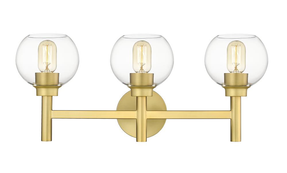 The precision of a perfect circle defines the modern ambiance of a contemporary three-light vanity wall light. From the Sutton collection, the sconce boasts a trio of torch-style lights, complete with warm brushed gold finish framing and a round wall plate. Three open-edged globe shades are precisely crafted in clear glass, delivering maximum illumination to your vanity and bathroom space.