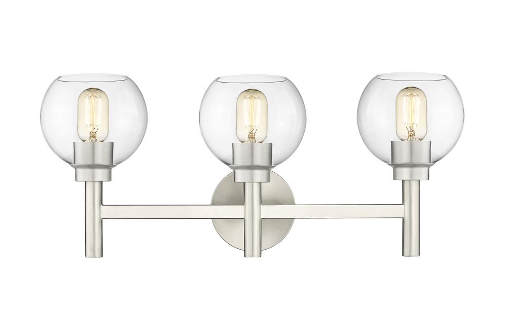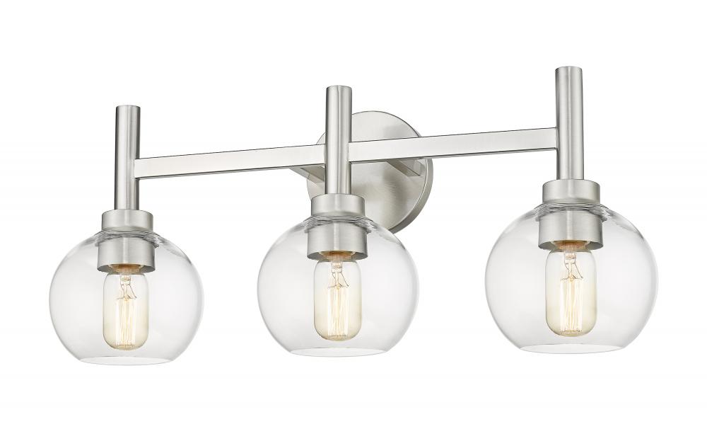 The precision of a perfect circle defines the modern ambiance of a contemporary three-light vanity wall light. From the Sutton collection, the sconce boasts a trio of torch-style lights, complete with brushed nickel finish framing and a round wall plate. Three open-edged globe shades are precisely crafted in clear glass, delivering maximum illumination to your vanity and bathroom space.
