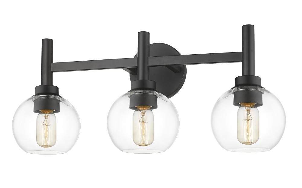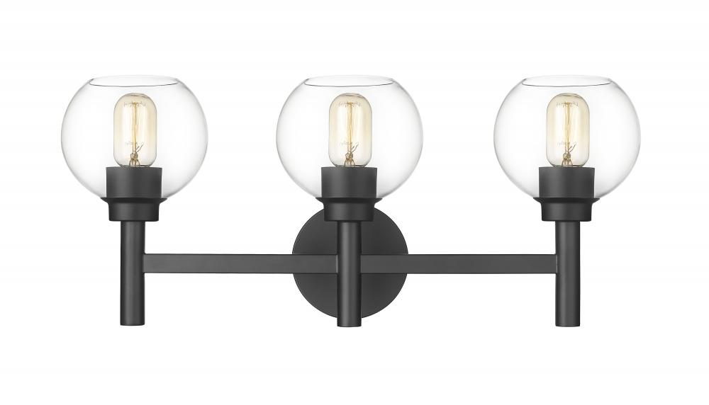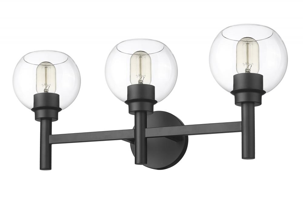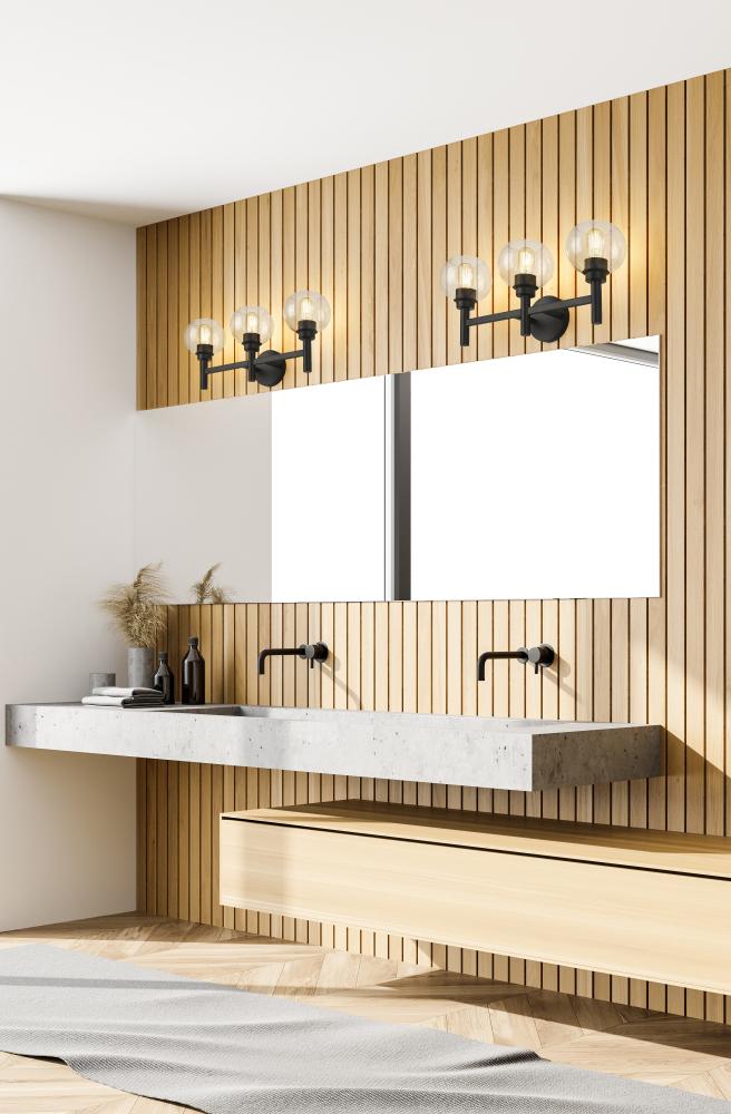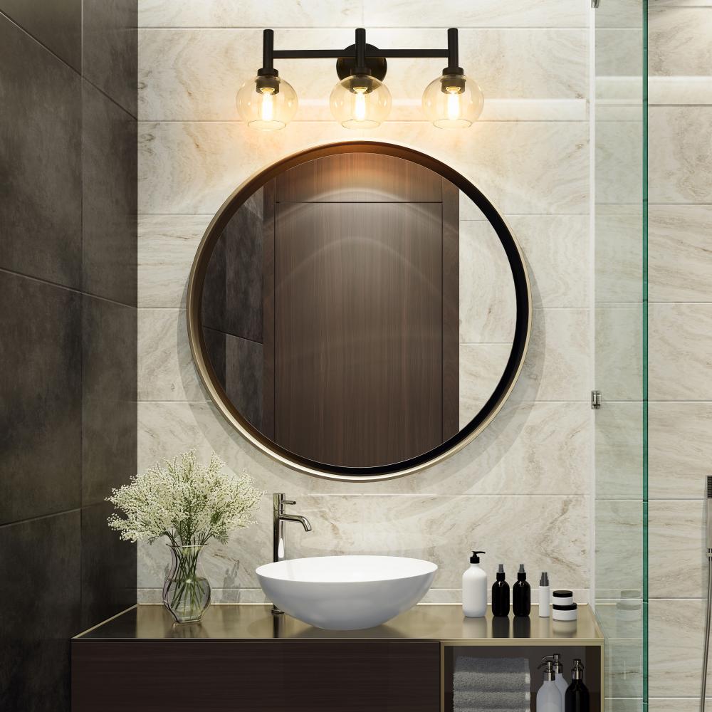 The precision of a perfect circle defines the modern ambiance of a contemporary three-light vanity wall light. From the Sutton collection, the sconce boasts a trio of torch-style lights, complete with chic matte black finish framing and a round wall plate. Three open-edged globe shades are precisely crafted in clear glass, delivering maximum illumination to your vanity and bathroom space.