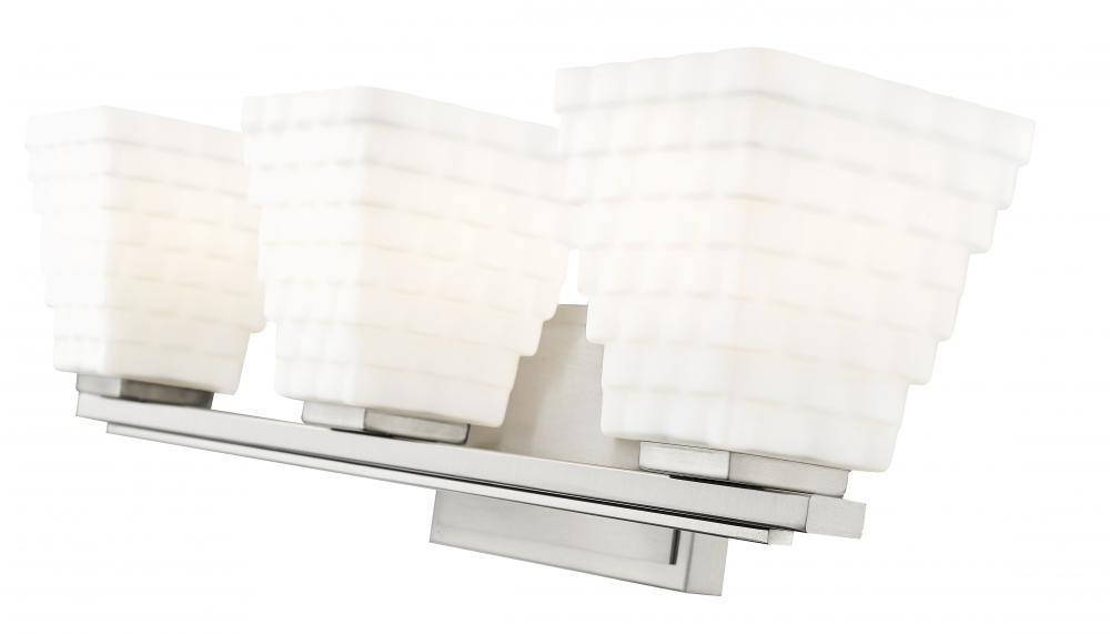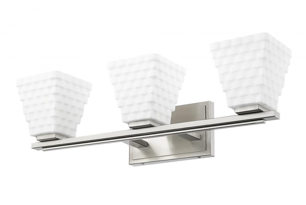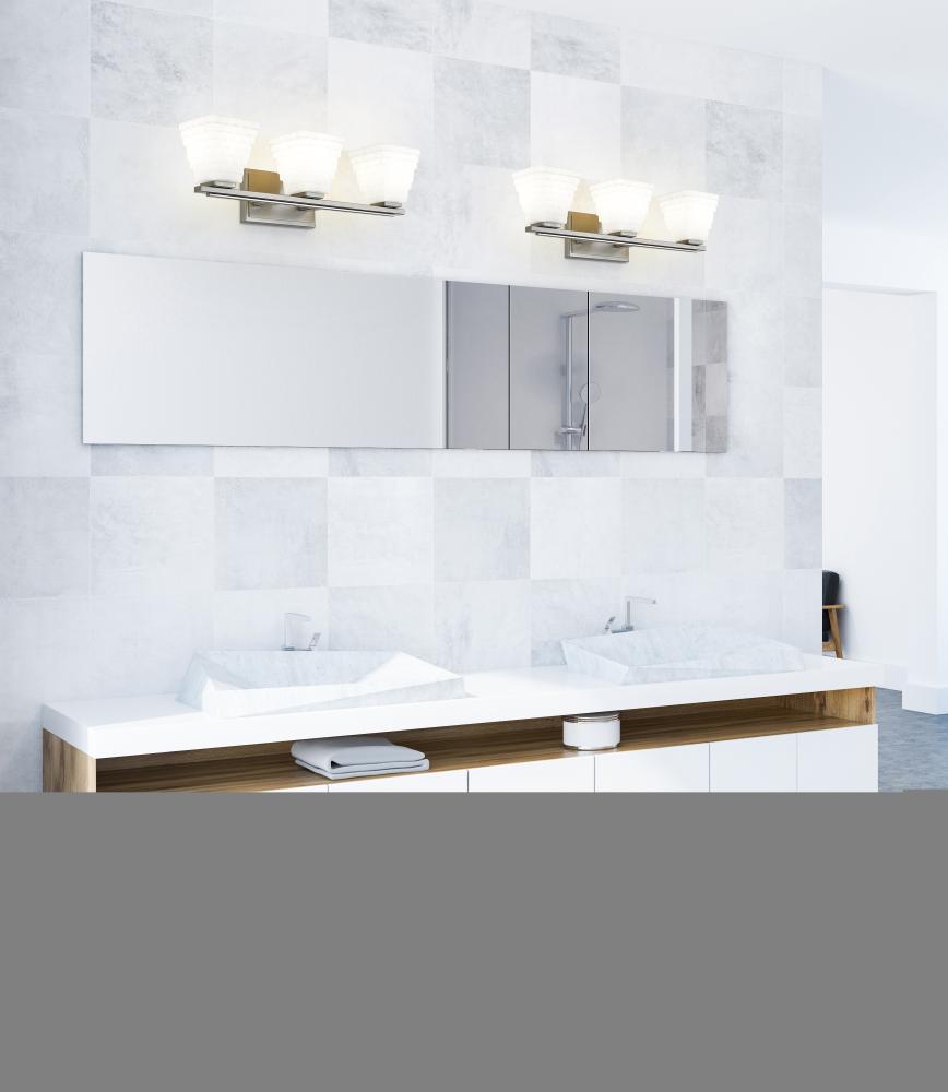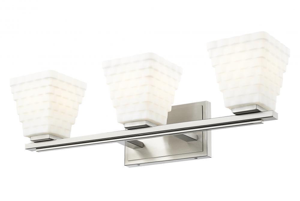 Brushed nickel finishing sets an understated ambiance for this modern three-light vanity bath light. Tapering square shades feature layered rectangles of opal glass, casting bright, diffused illumination thats ideal for daily rituals. Its backplate and sleek arm are enhanced with layered trim, creating a hint of texture and dimension thats perfect for a contemporary upgrade.