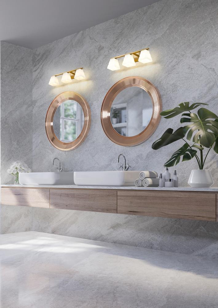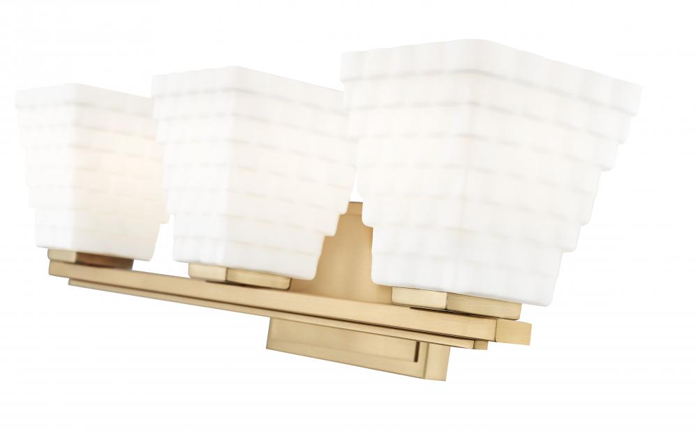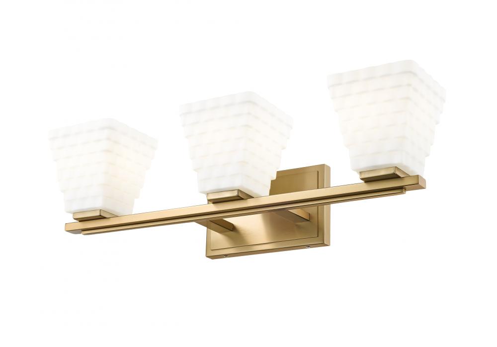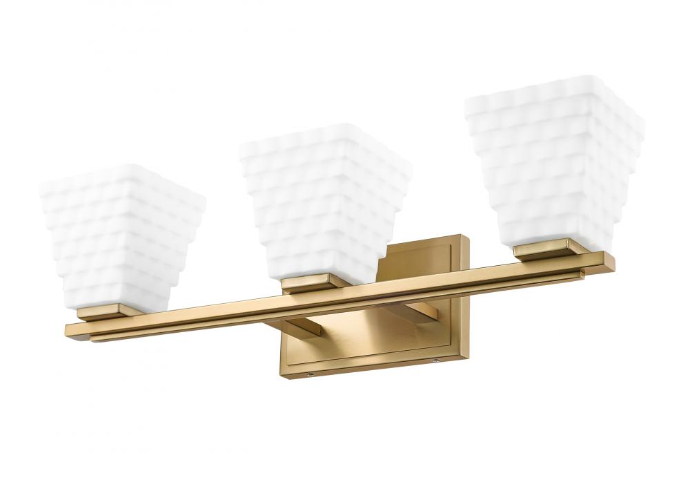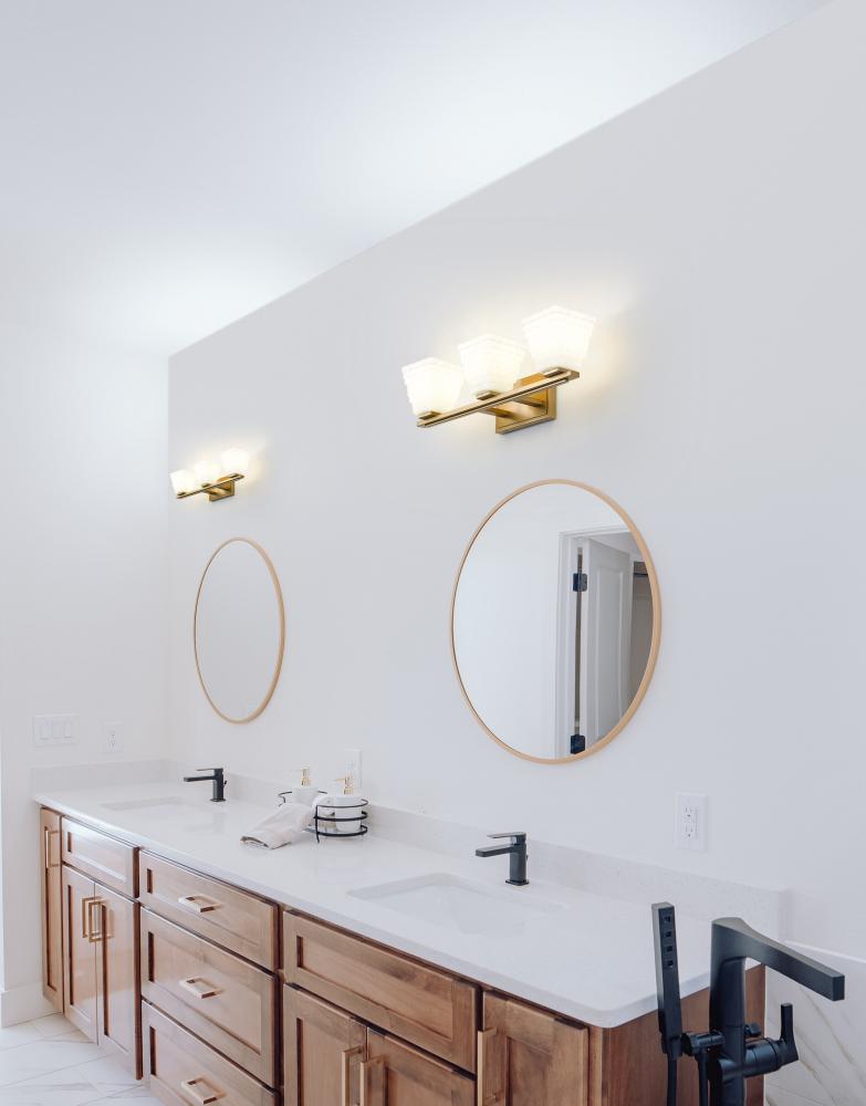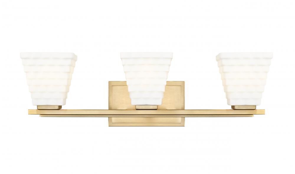 Instill a sense of warmth with the exceptional modern gold finish featured on this contemporary three-light vanity bath light. Its superb structure is enhanced with engaging dimension, owing to its layered details on both its arm and backplate and trio of shades. Each shade is a tapering square presentation with layered rectangles of opal glass that diffuse illumination and create inviting ambiance.