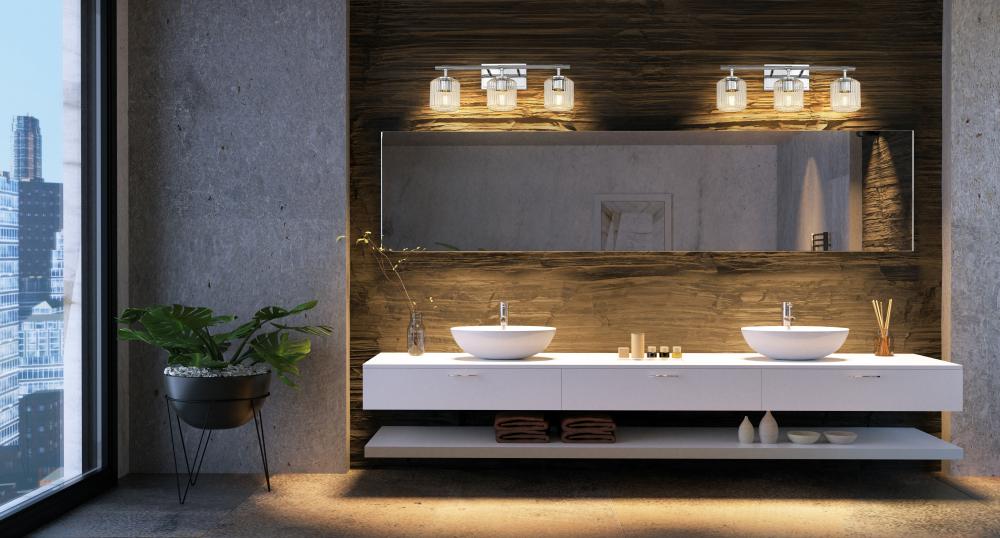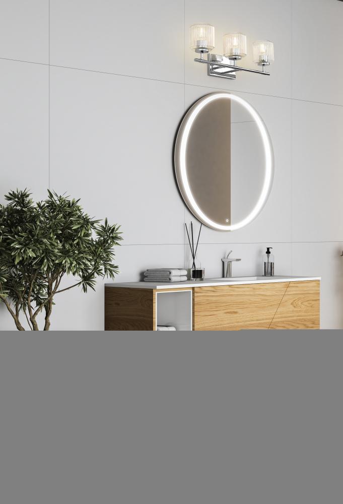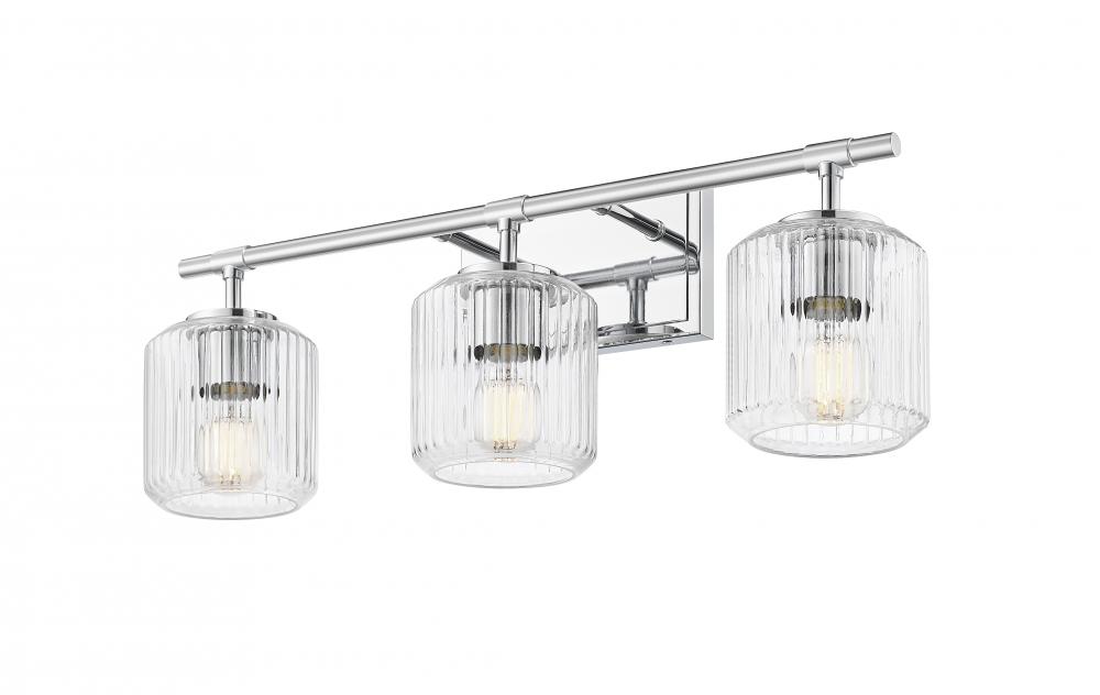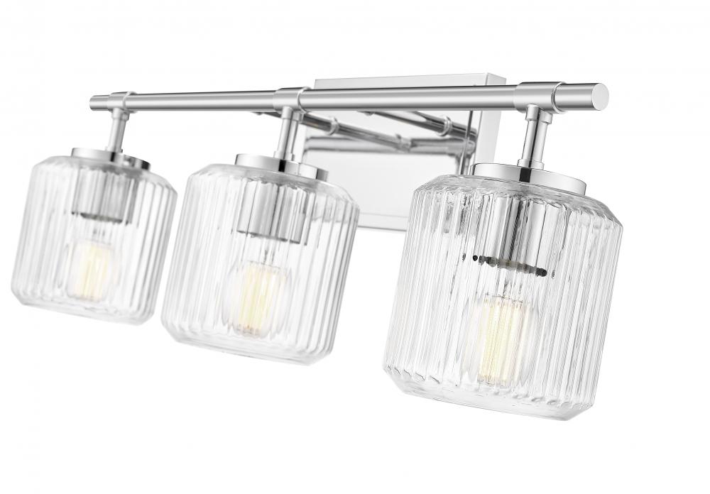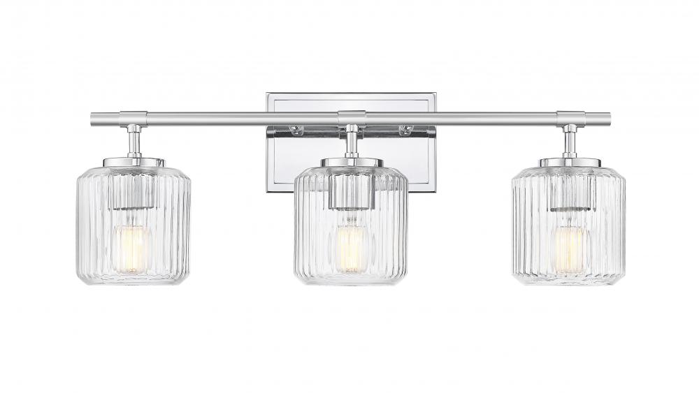 A chrome finish frame gleams in the light of this modern three-light vanity bath light. It features a trio of clear ribbed glass shades that create a refreshing, sophisticated ambiance. The shades almost undulate in the light, creating the perfect dimensional finishing touch over your vanity.