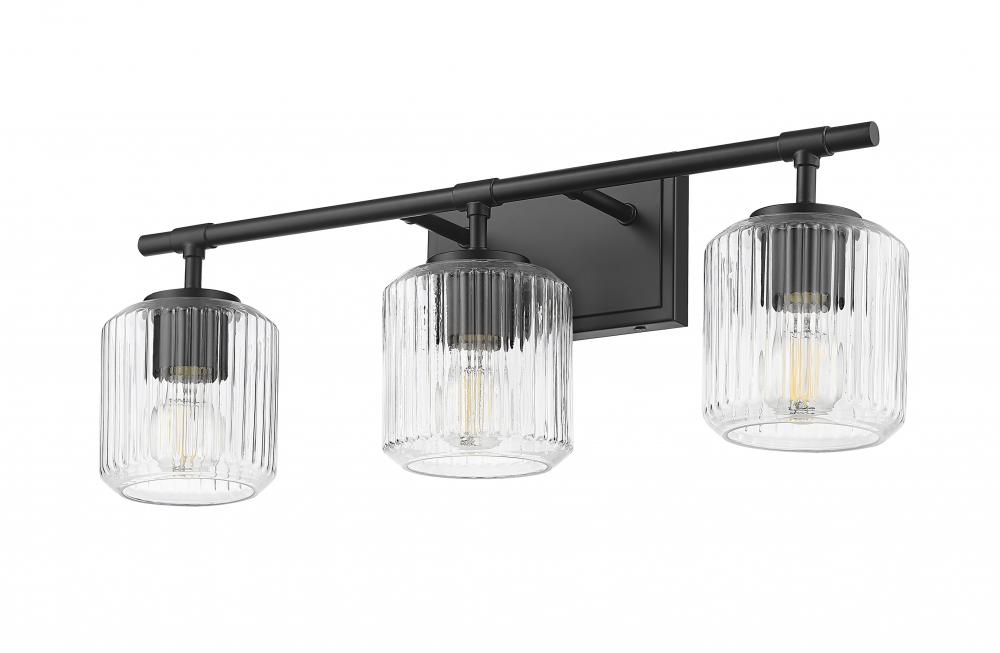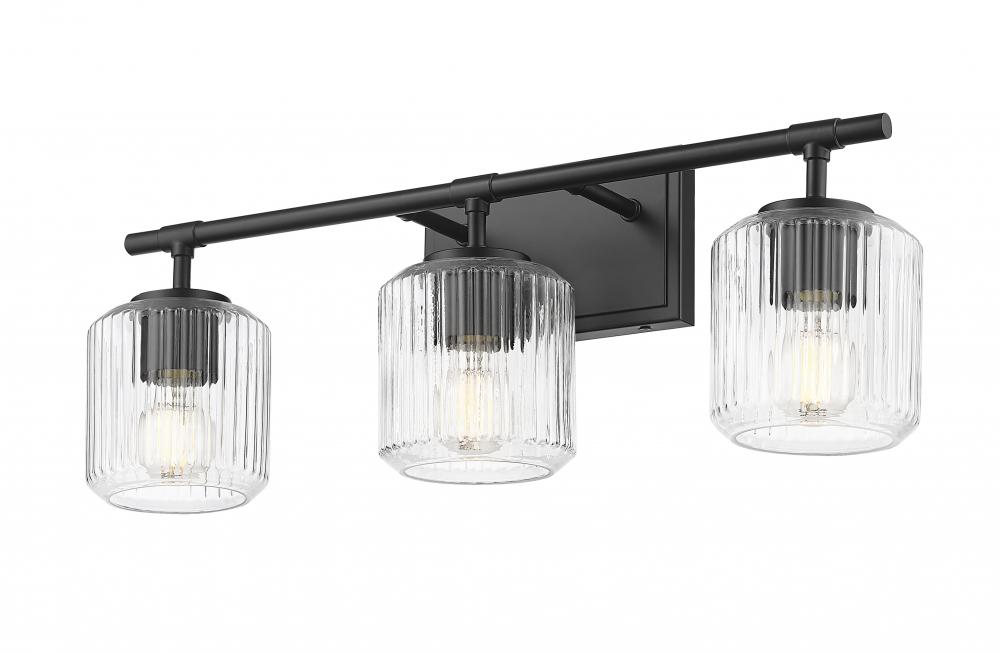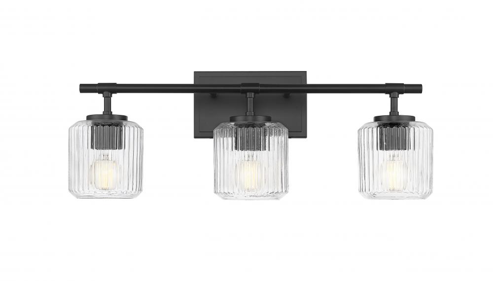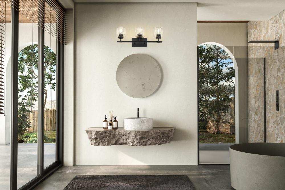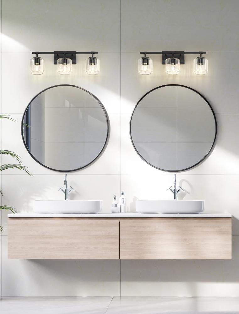 Cool and crisp matte black provides bold, rich style for a modern three-light vanity bath light. Superb in its craftsmanship, the fixture features a clean-lined framework that pairs perfectly with a trio of delicate ribbed glass shades that bring sparkling allure. Its the perfect choice for a refined primary or guest en suite.