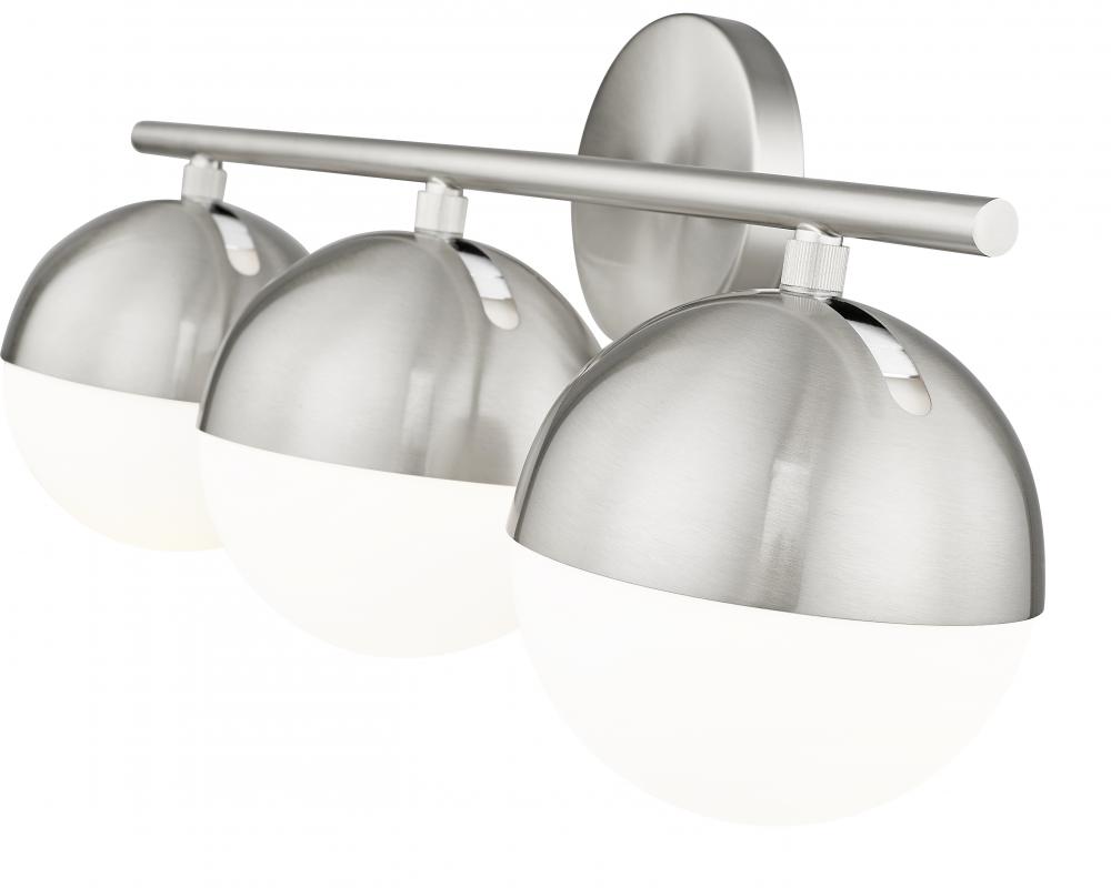 Brighten your en suite with the fresh, refined look of this mid-century three-light vanity bath light. It delivers even, glare-free illumination with opal glass orb shades that are complemented with metal shields that can be moved to create the perfect look and feel. A brushed nickel finish adds understated elegance, blending into myriad settings and design motifs.