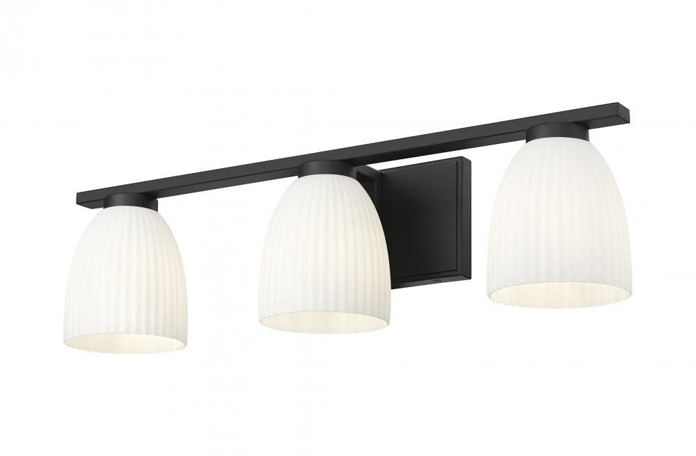 This three-light vanity fixture stands out with its bold matte black finish and sculptural silhouette. Matte opal glass shades add softness with ribbed texture that tempers brightness into a gentle wash. It?s a strong visual anchor that brings modern refinement to your daily routine.