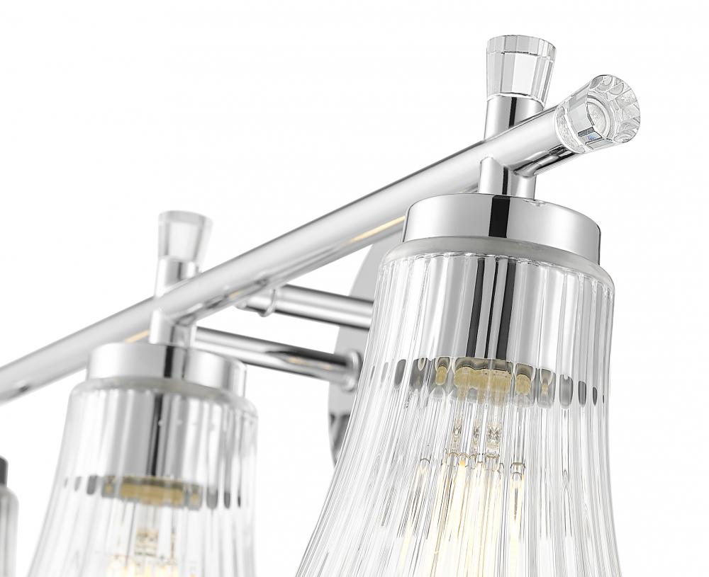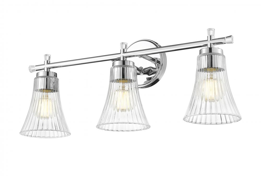 Chrome adds a mirror-like brilliance to this three-light vanity fixture, giving it a crisp, polished presence. Fluted clear glass shades catch the light with elegance, reflecting subtle sparkle across the room. It?s a sleek and graceful update that turns daily routines into radiant rituals.