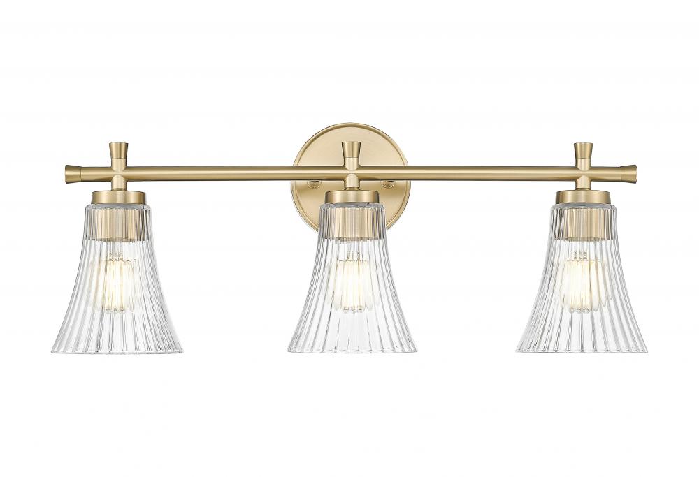 This three-light vanity fixture glows with elegance in a modern gold finish, balanced by the brilliance of fluted clear glass. The crystal-inspired curves offer texture and light play, casting a delicate shine that flatters any space. It?s graceful, golden, and perfectly tailored for beauty-focused interiors.