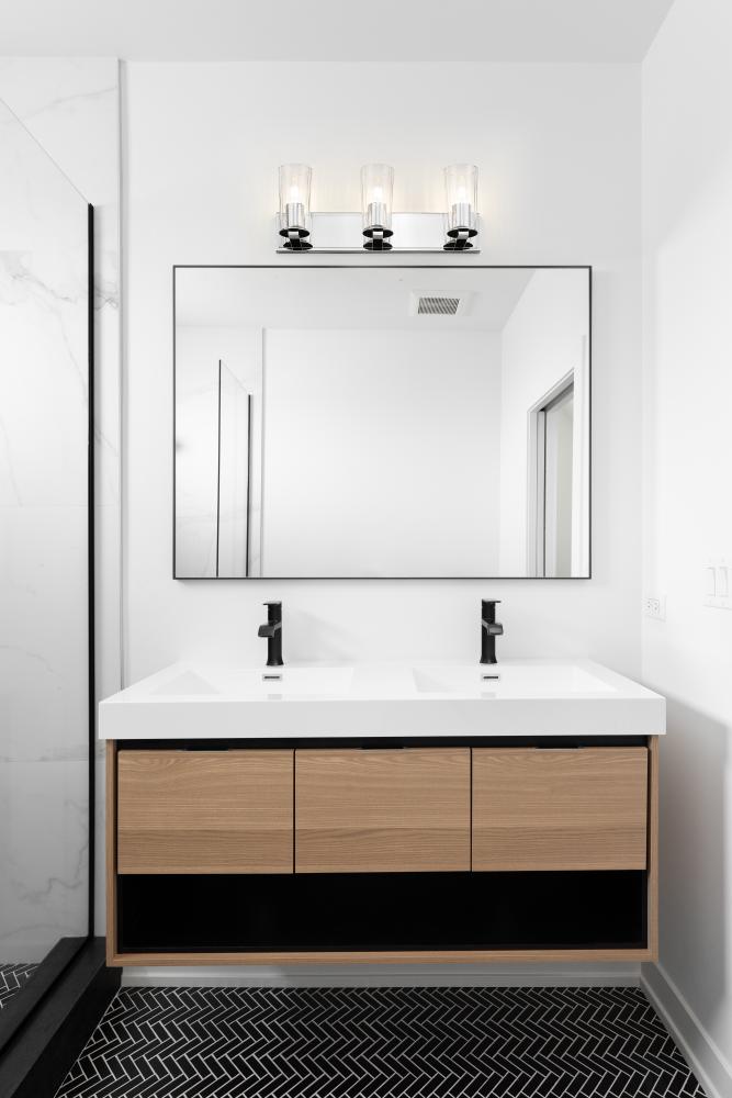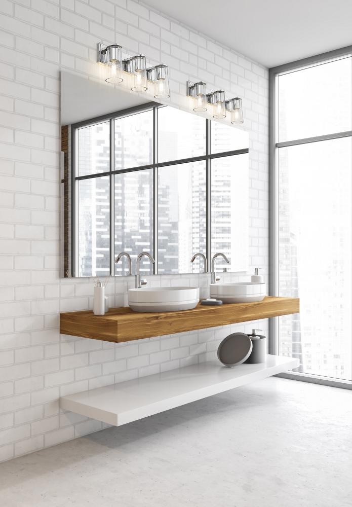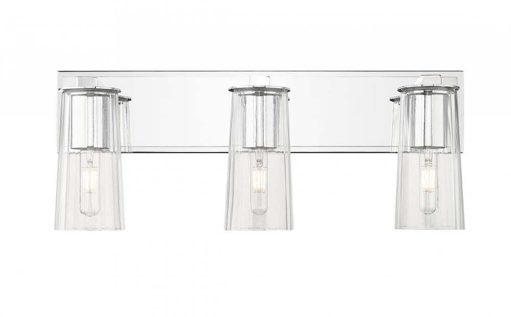 Infused with vintage industrial charm, this modern three-light vanity fixture is the perfect upgrade for an inviting bath. It pairs a rectangular wall plate with a gleaming chrome finish, adding a clean, bright style. Tapered glass shades host tubular bulbs, delivering the perfect touch of old-time character.