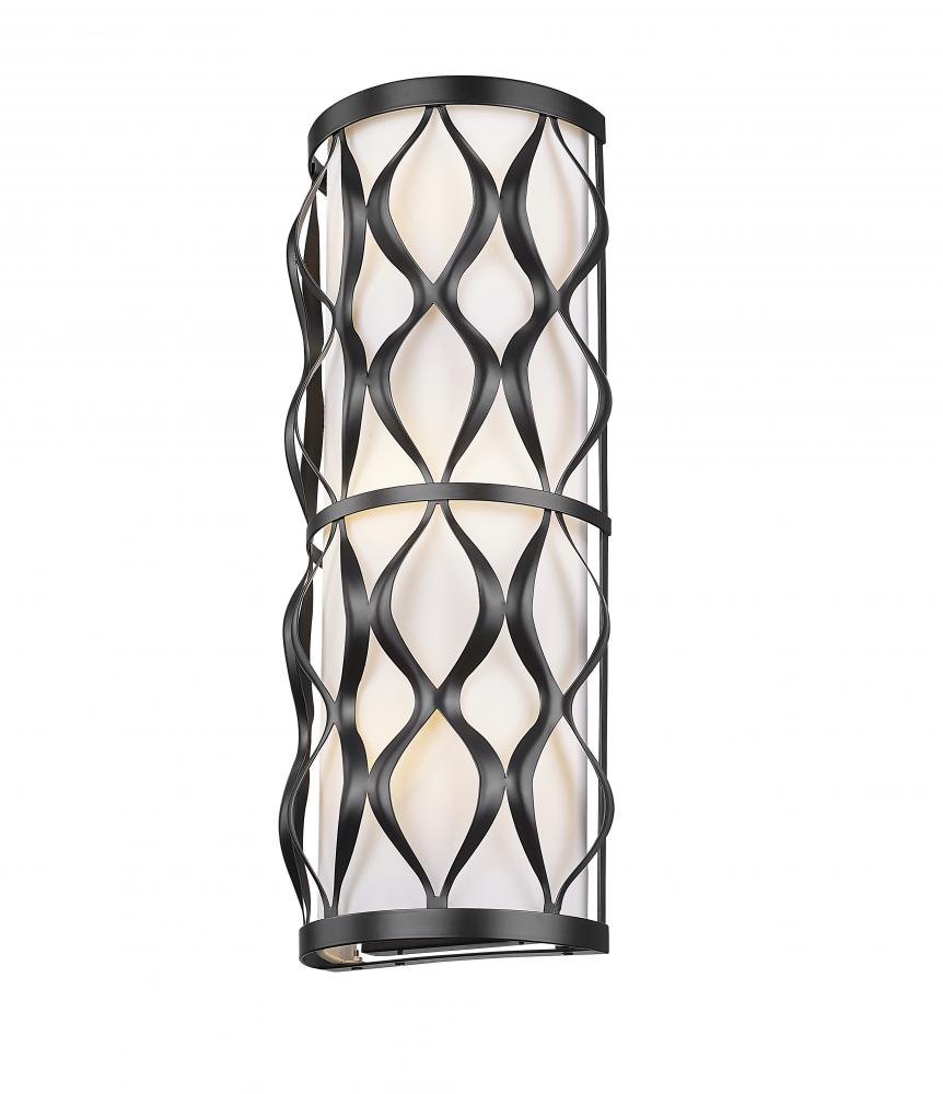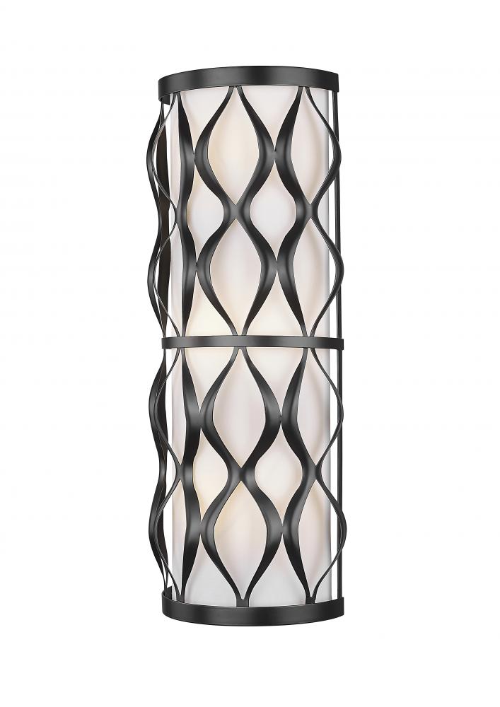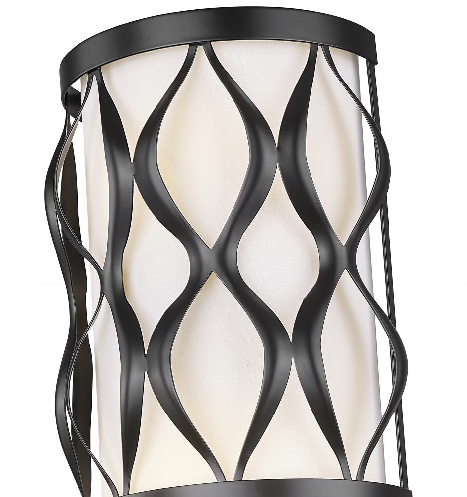 With an open-concept design marked by wavy vertical metal elements perfectly spaced on its matte black finish steel frame, this three-light wall sconce reflects a gallery influence as it illuminates hallways, living areas, and bedrooms. Candelabra-style lights glow through a white fabric diffuser, a tantalizing contribution to its curvy ribbon detailing. Timeless and seamless style add versatility and a theatrical flavor to this elegant wall sconce.