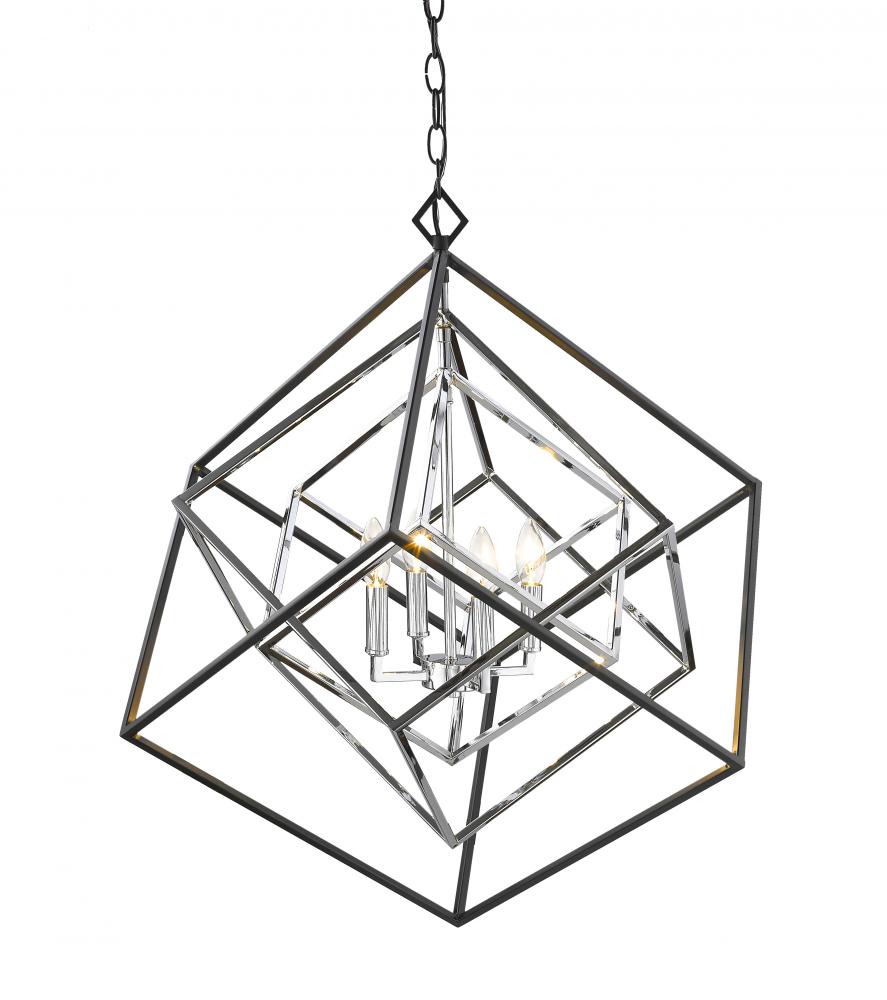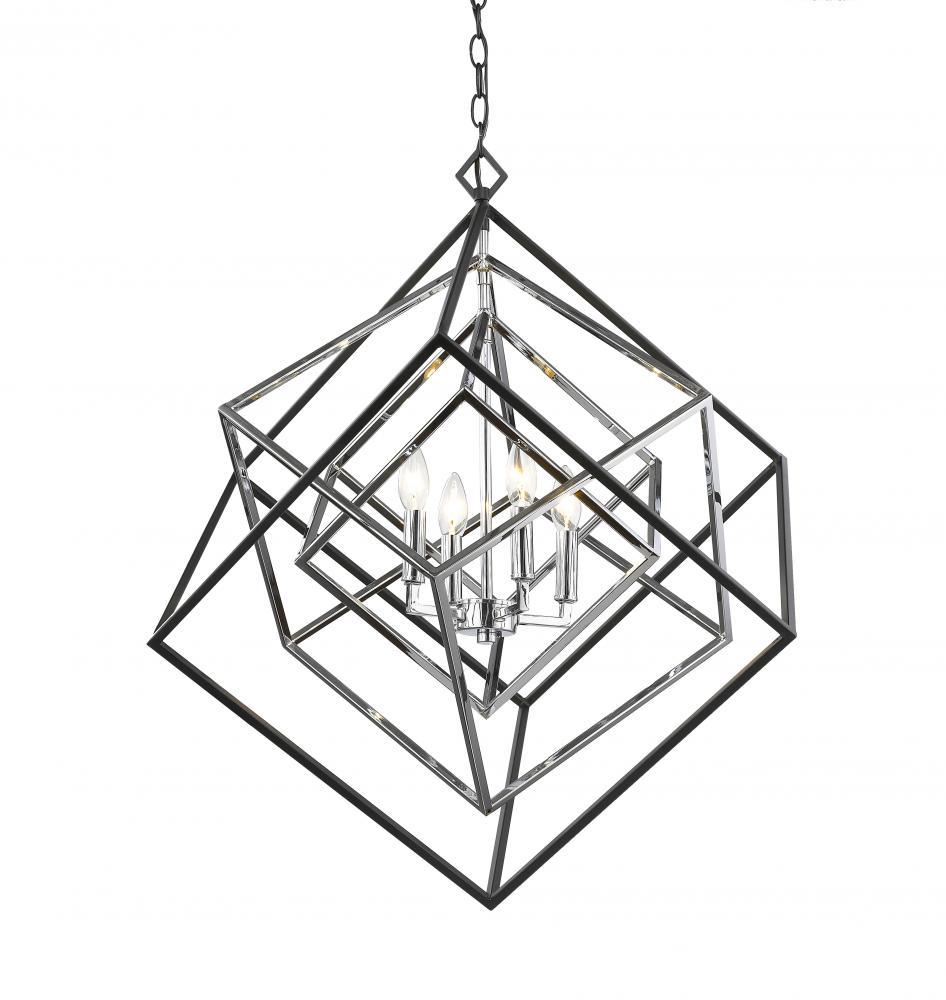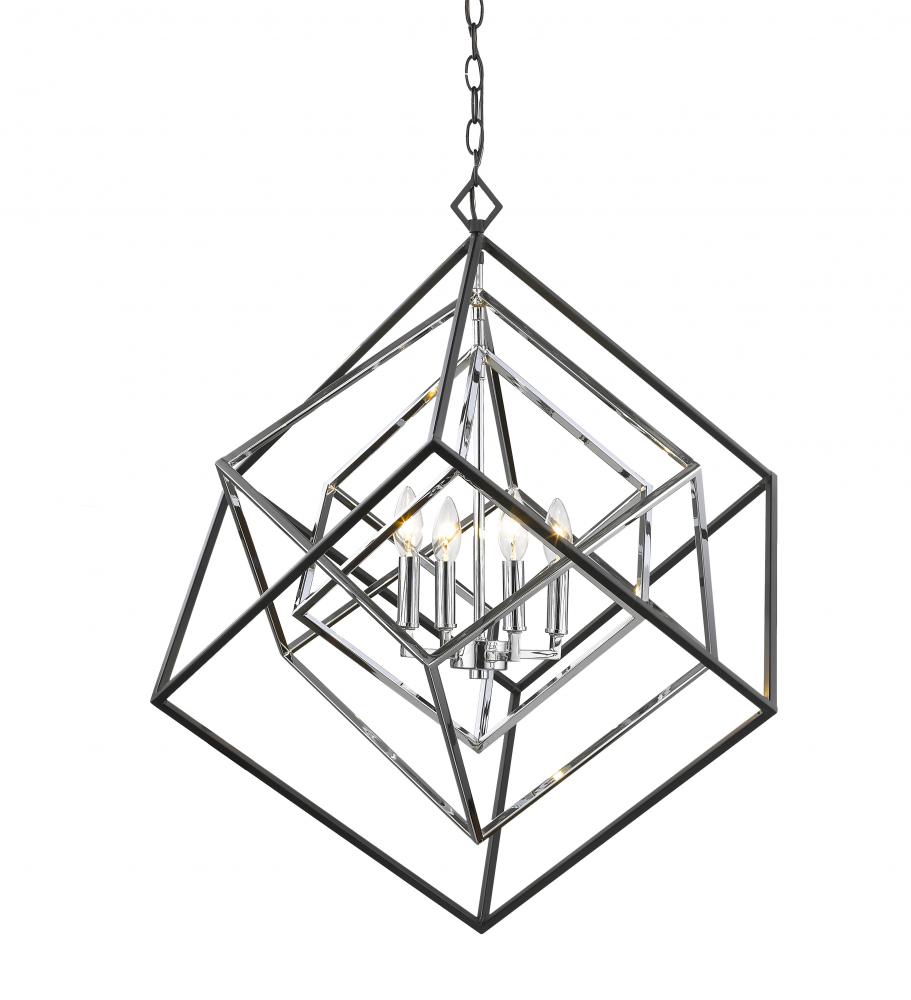 At the center of this modern, freshly designed four-light chandelier is a charming candelabra-style bulb mount that presents a fun juxtaposition. Bringing ambiance and energy to a contemporary space, this four-light chrome and matte black finish chandelier becomes a focal point in any room.