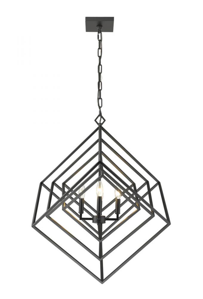 Clean lines and dramatic geometric patterns define this three-light chandelier in matte black. This contemporary design is crafted from steel with a matte black finish and features candelabra bulbs.