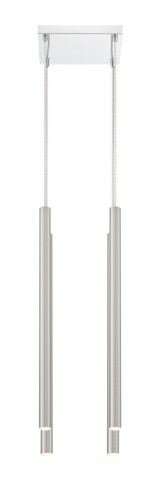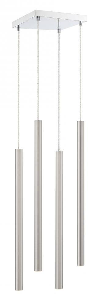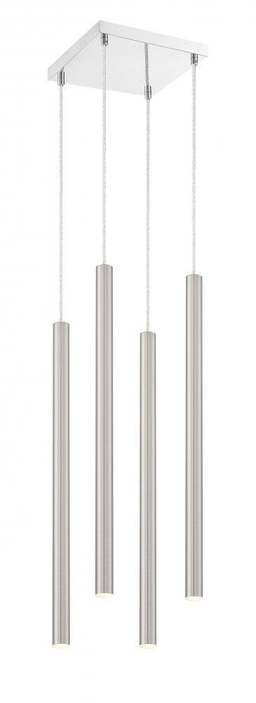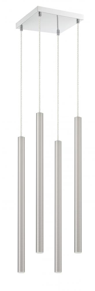 Radiant brushed nickel makes this four-light pendant light perfect for a modern bathroom. Complete with a windchime-inspired silhouette, the clean lines boast a sleek feel.