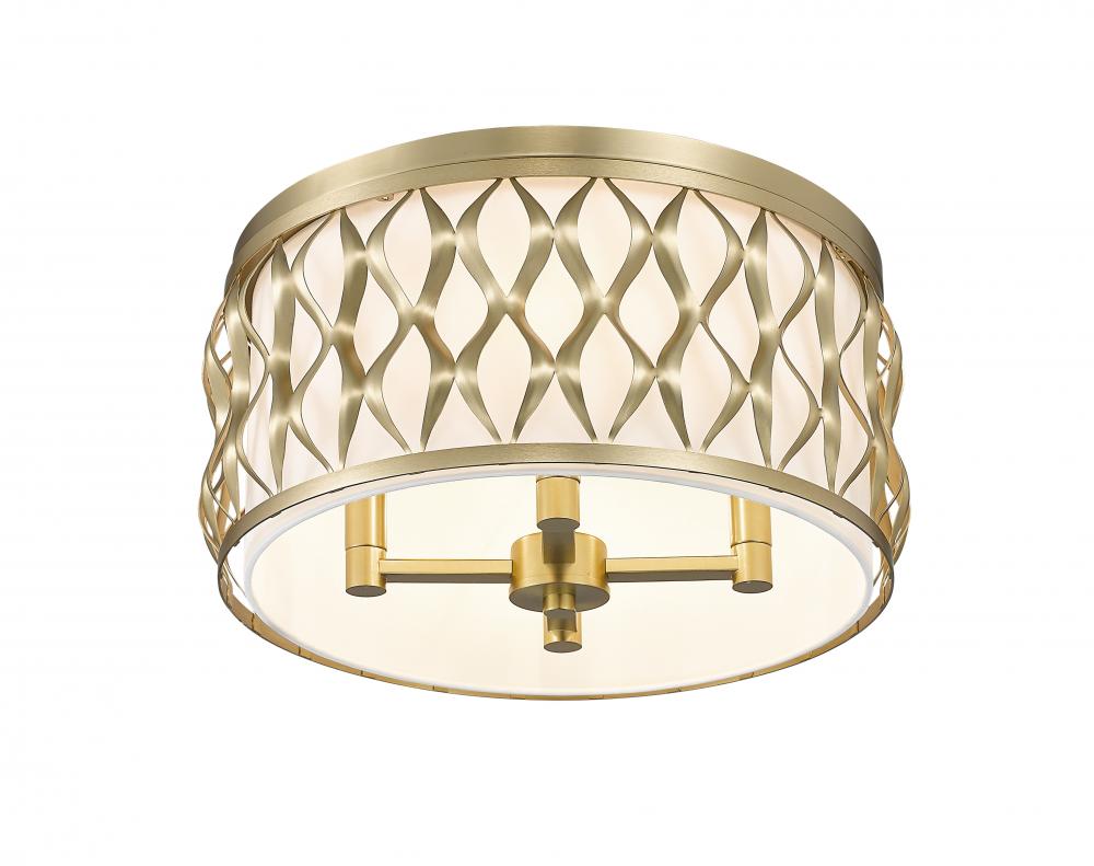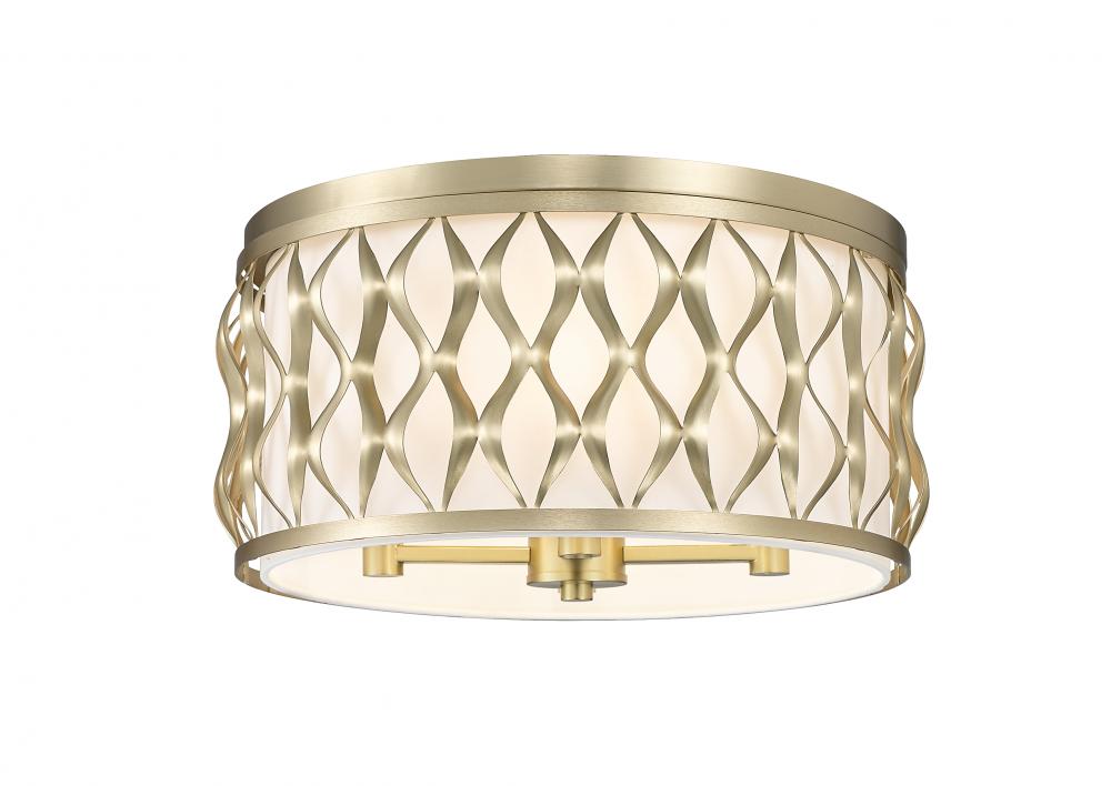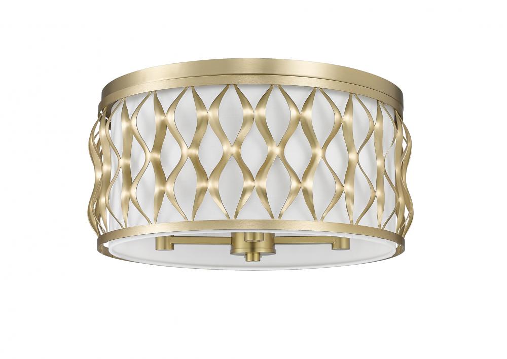 Sculptural transitional artisan flavor is perfect for any setting as this modern gold finish steel four-light flush mount ceiling light captures deserved attention. Living rooms, dining spaces, and foyers receive a timeless style motif with a drum-shaped fixture featuring symmetrical ribbon waves cascading vertically, banded on both edges. A white diffuser filters glowing light, creating superb optical ergonomics.