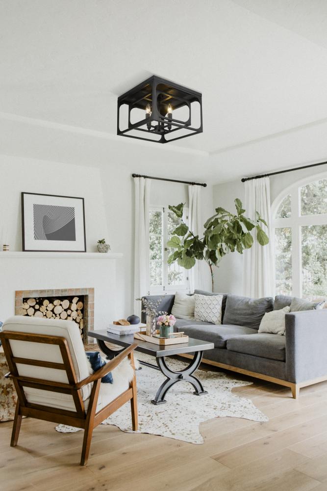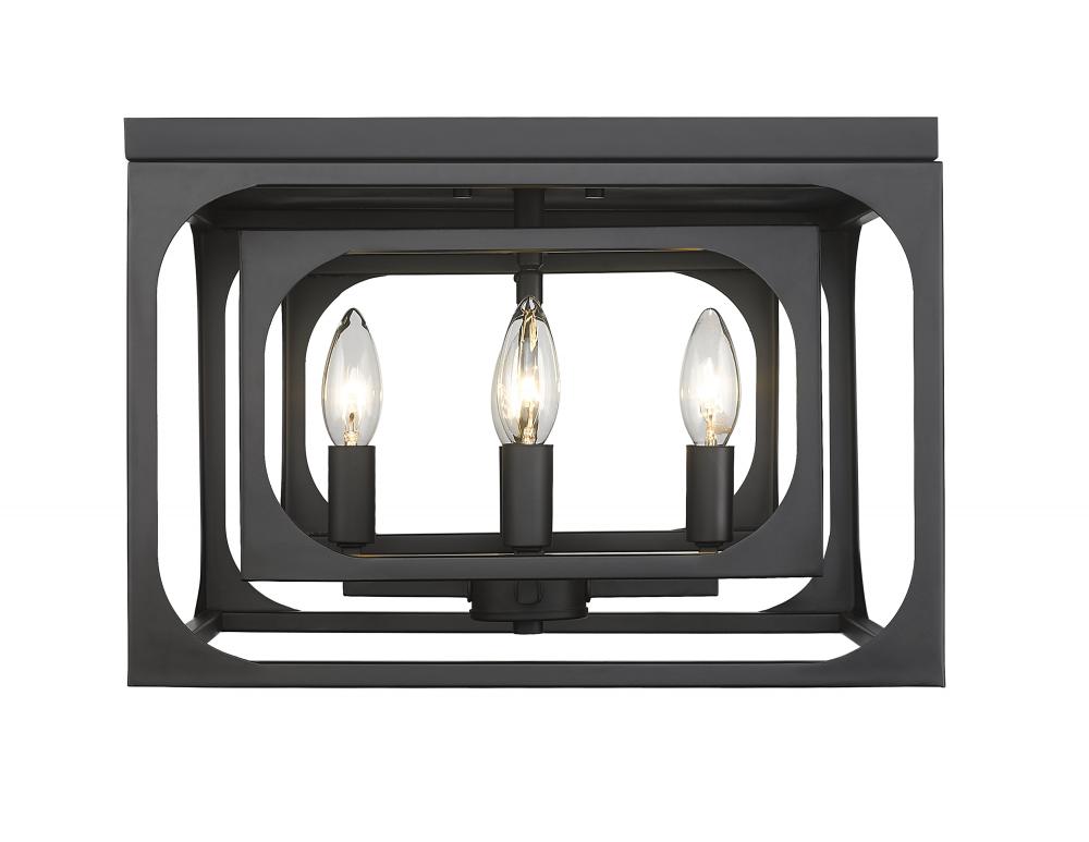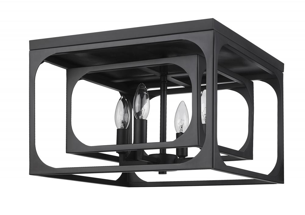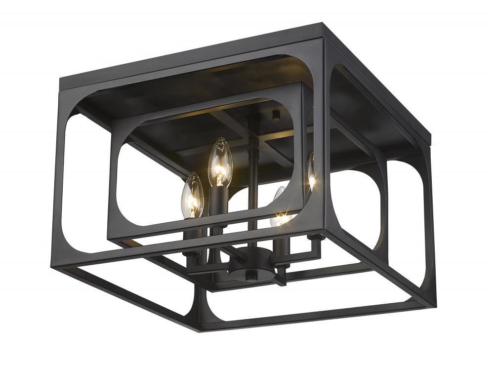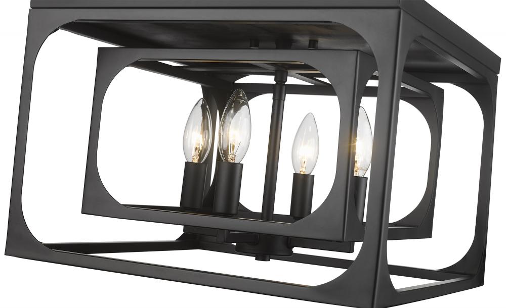 Bold modern personality adopts an exceptional layered look with minimalism at its core, creating a tasteful light fixture that pays tribute to the trending blended motif of farmhouse and industrial. The Easton collection offers a four-light flush mount ceiling light with linear elements and an orderly aesthetic ideal for a signature style. Candelabra bulb mounts align in a graduated arrangement, centered in full view thanks to a dual-layered openwork matte black finish metal frame.